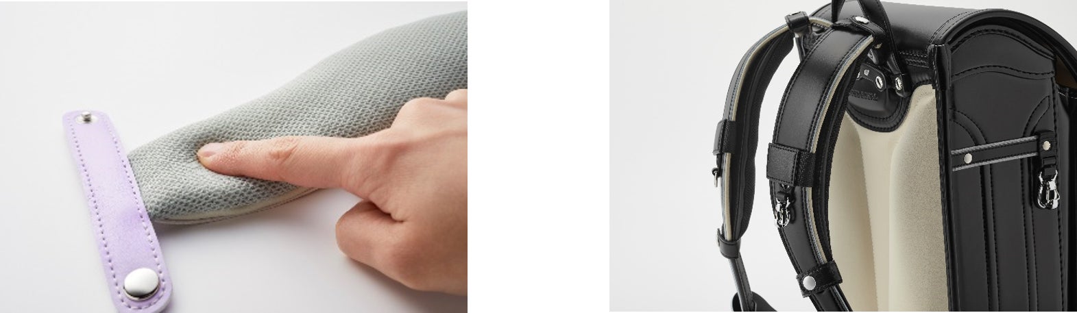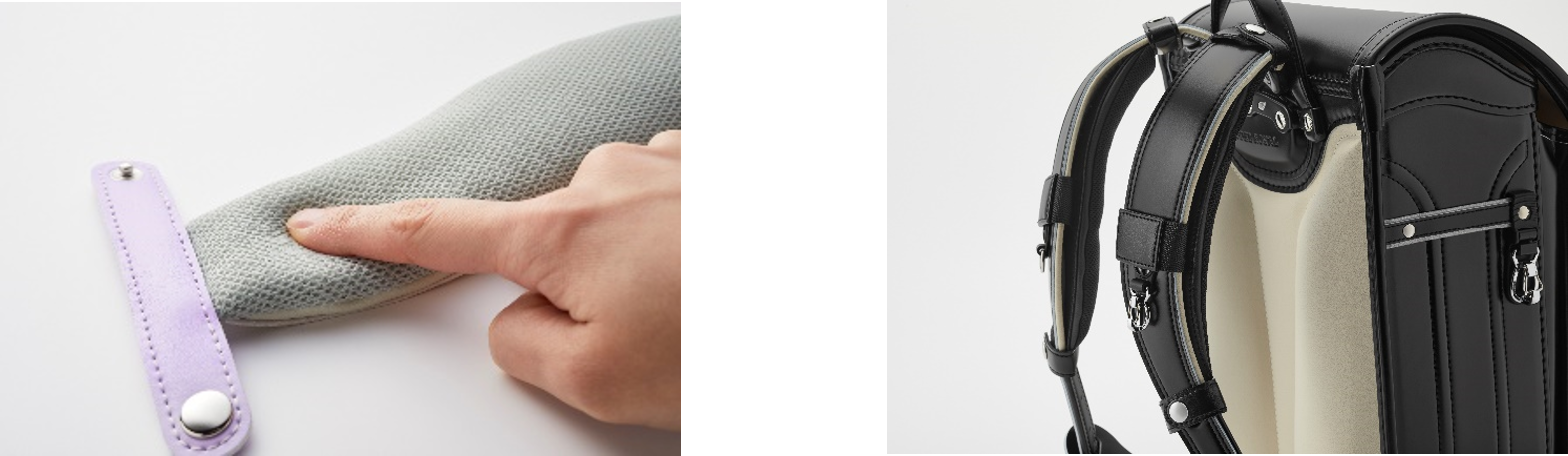 ビーズクッションは、大手メーカーのMOGU®パウダービーズ®を使用しており、現在特許出願中です。流動性のあるパウダービーズ®によって、肩とベルトとのすき間をなくし、やわらかく密着させることで、からだへの負担を軽減し、快適にランドセルを背負っていただけます。