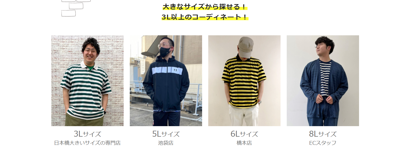 - XS~10Lまでの幅広いサイズ展開をスタッフの個性を活かし、スタイリング提案