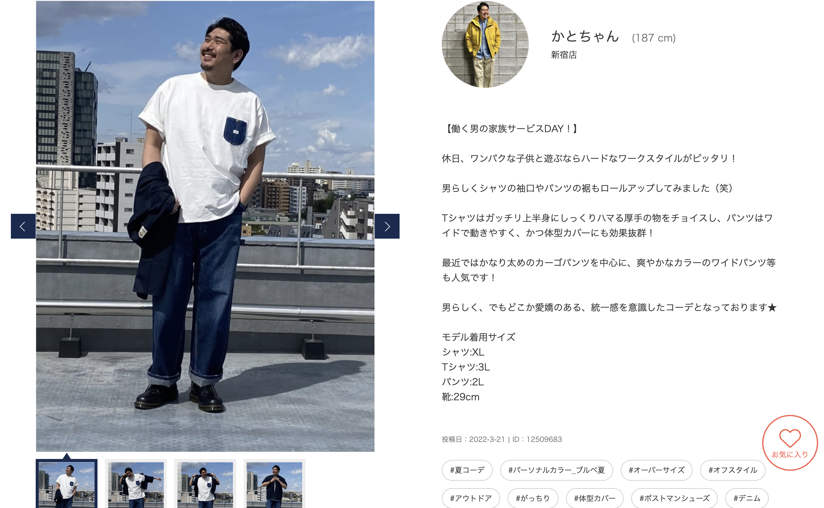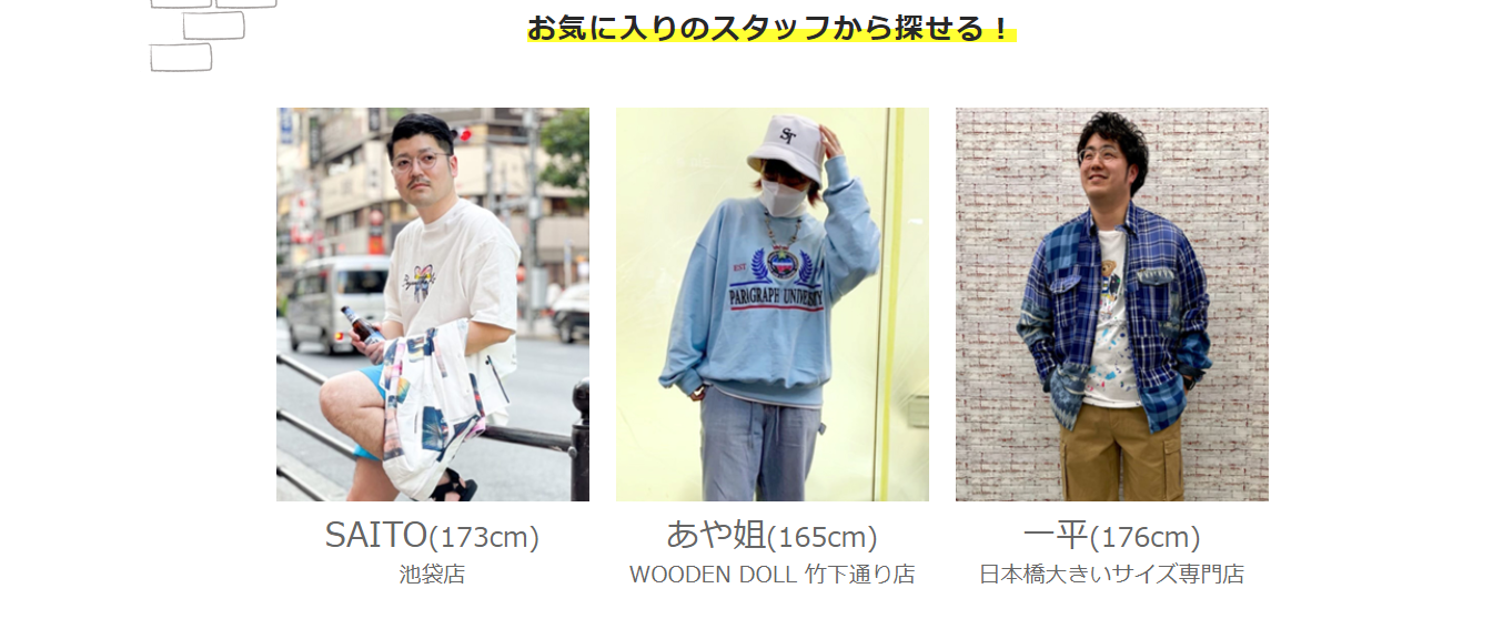 自分の体型に近いスタッフやお気に入りのスタイリングのスタッフから探すことも可能。カジュアルからビジネスまでを扱う店舗や大きいサイズのみを扱う「大きいサイズ専門店」などサカゼンならではの店舗スタッフを見つけてみてください。