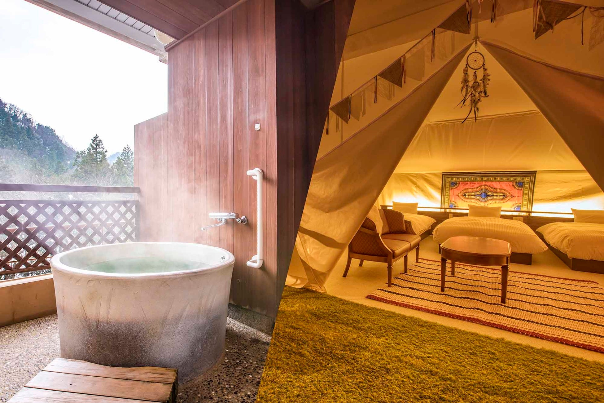 <露天風呂付客室・室内グランピングルーム>湯快リゾート3ホテルで新タイプの客室が12月中旬よりオープン!ご予約受付中!