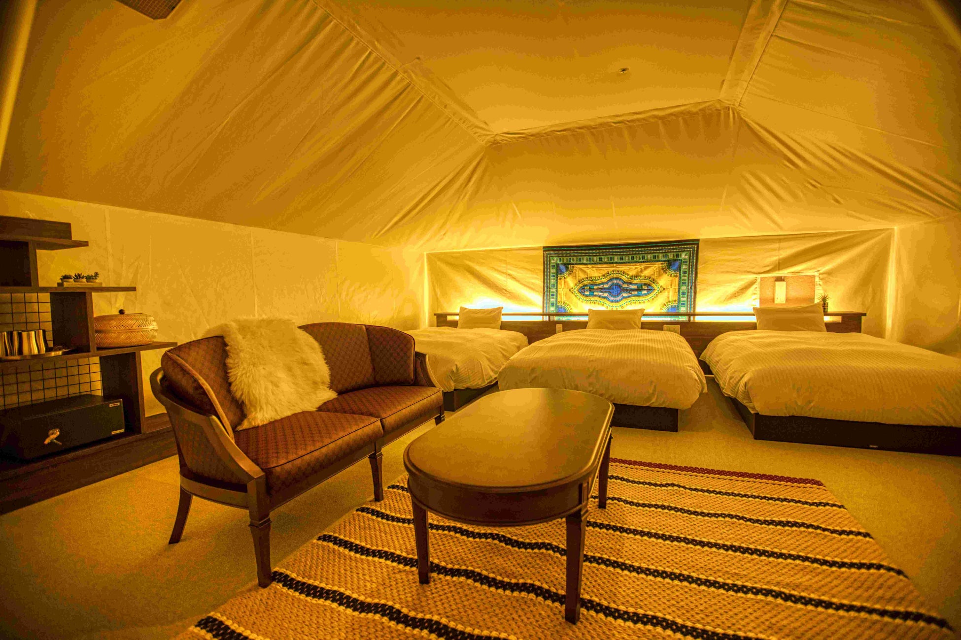室内でグランピング体験ができる新感覚のお部屋です。大型テント内で本格的なグランピング設備を揃えており、雰囲気抜群です。ホテル内にあるため、普段ご利用いただくお部屋と同じ感覚でご利用いただけます。