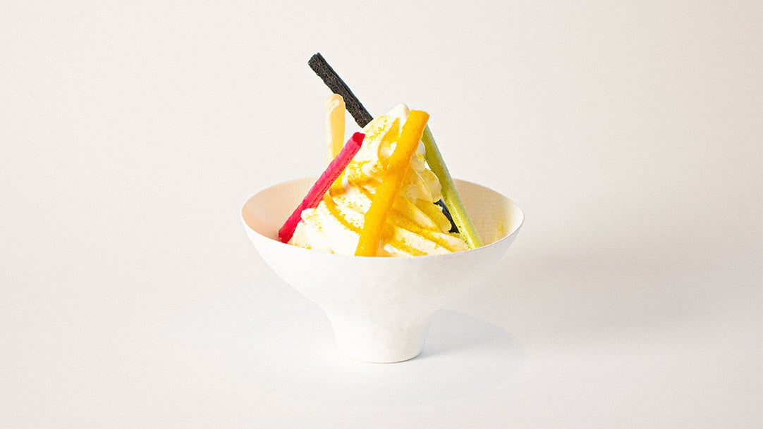 濃厚なバニラ香るソフトクリームに、爽やかな柑橘ゼストと、『MOTE MASCARA™』をイメージした5色のカラフルなスティック状のマカロンコックをトッピングしました。ボトムには『Made in ピエール・エルメ』の人気商品「メレンゲ」を忍ばせ、さくさくとした食感とアーモンドの香ばしい風味をアクセントに加えています。