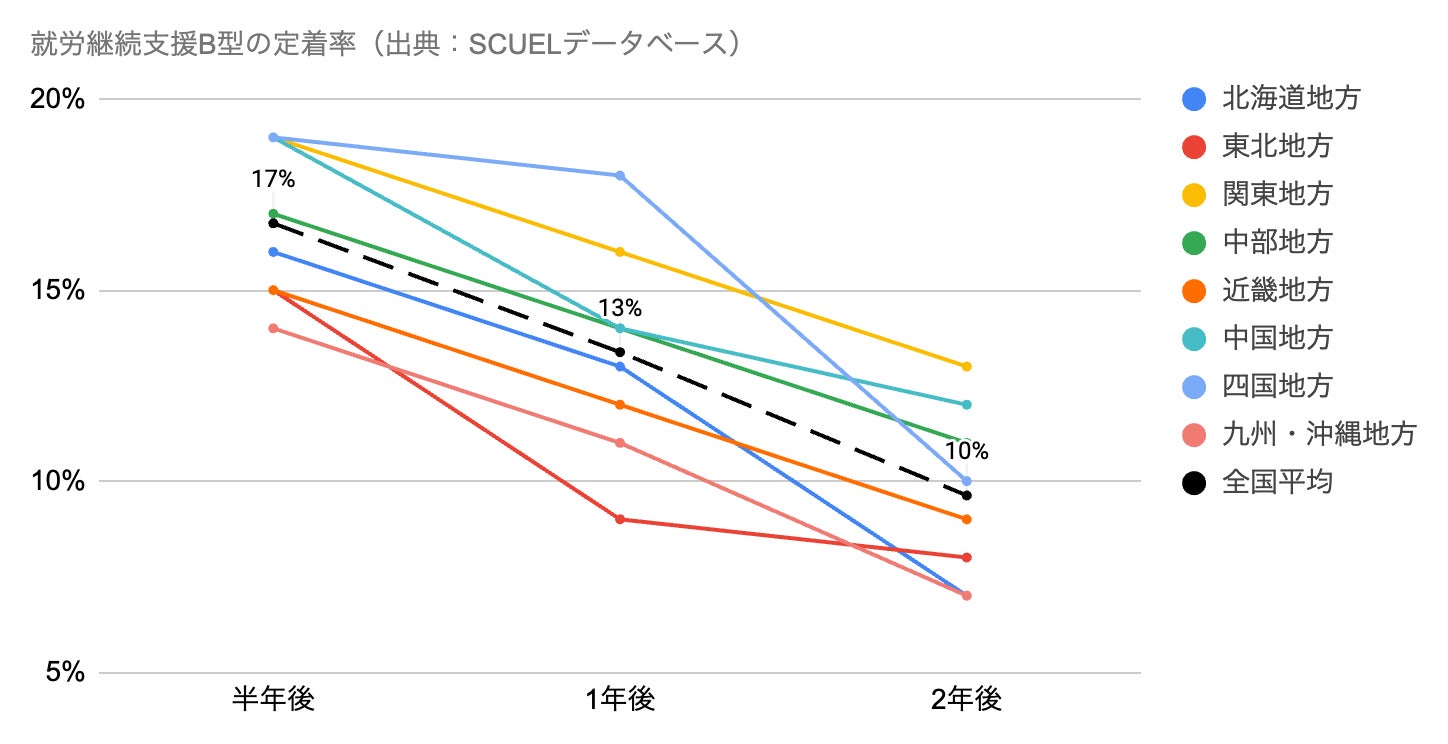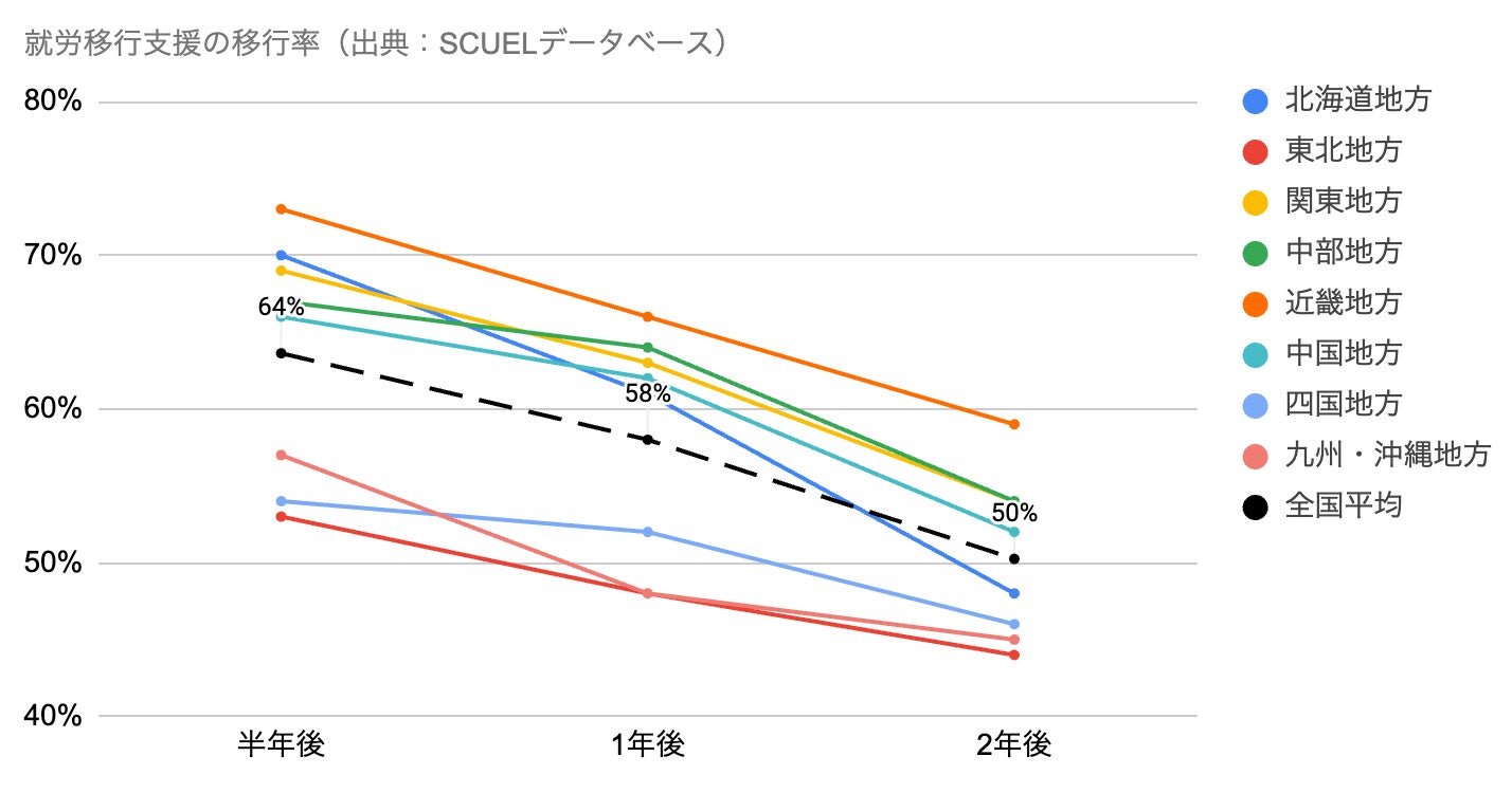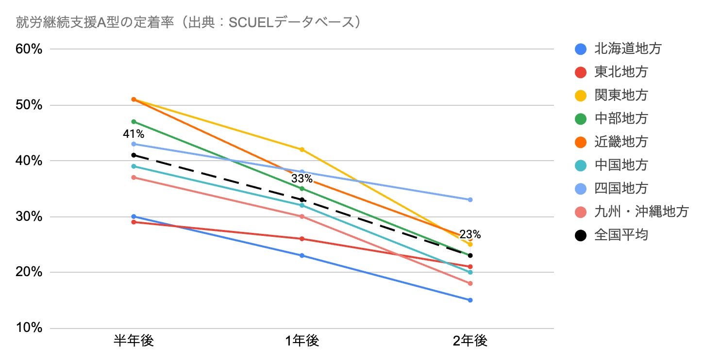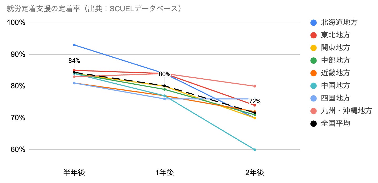 全国平均で「半年後→2年後」の定着率が41%→23%に低下。北海道・九州は20%未満に。
