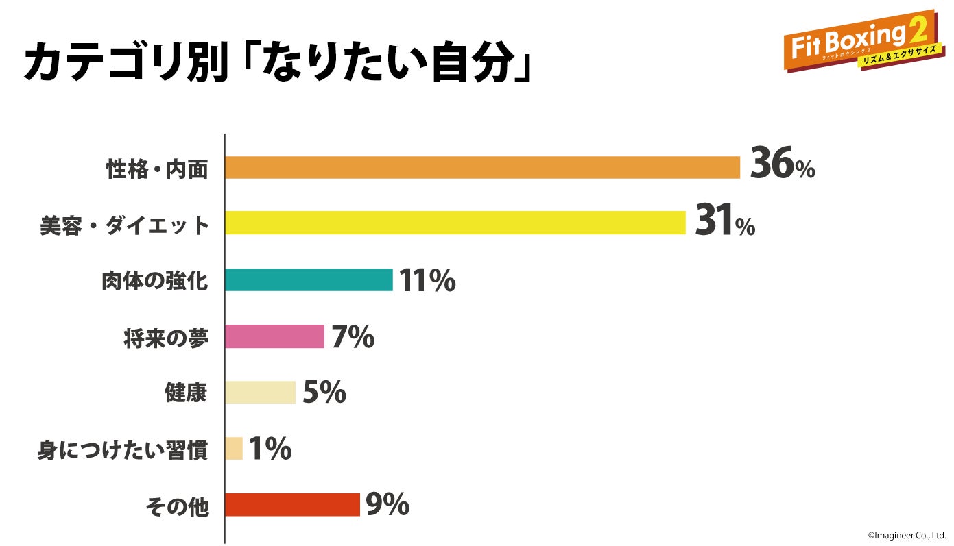 エクササイズソフトである「Fit Boxing 2」に関連して、美容・ダイエットや、肉体強化、健康に関することの投稿も多い中、最も多かったのは「間違ったことは間違っているとはっきり言えるようになりたい」「怒らないママになりたい」「自分自身を愛せるようになりたい」「自分の限界を、自分で決めない」などの「性格・内面」の理想に近づけたいという投稿でした。また、「第一志望の大学合格」「いつまでも素敵なレディでありたい」「植木職人になってステキに造園したい」といった将来の夢も多く前向きな投稿が数多く寄せられました。