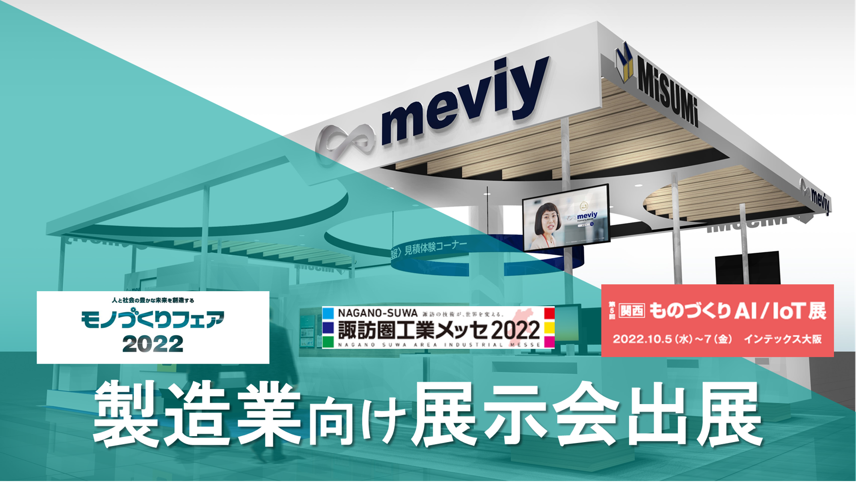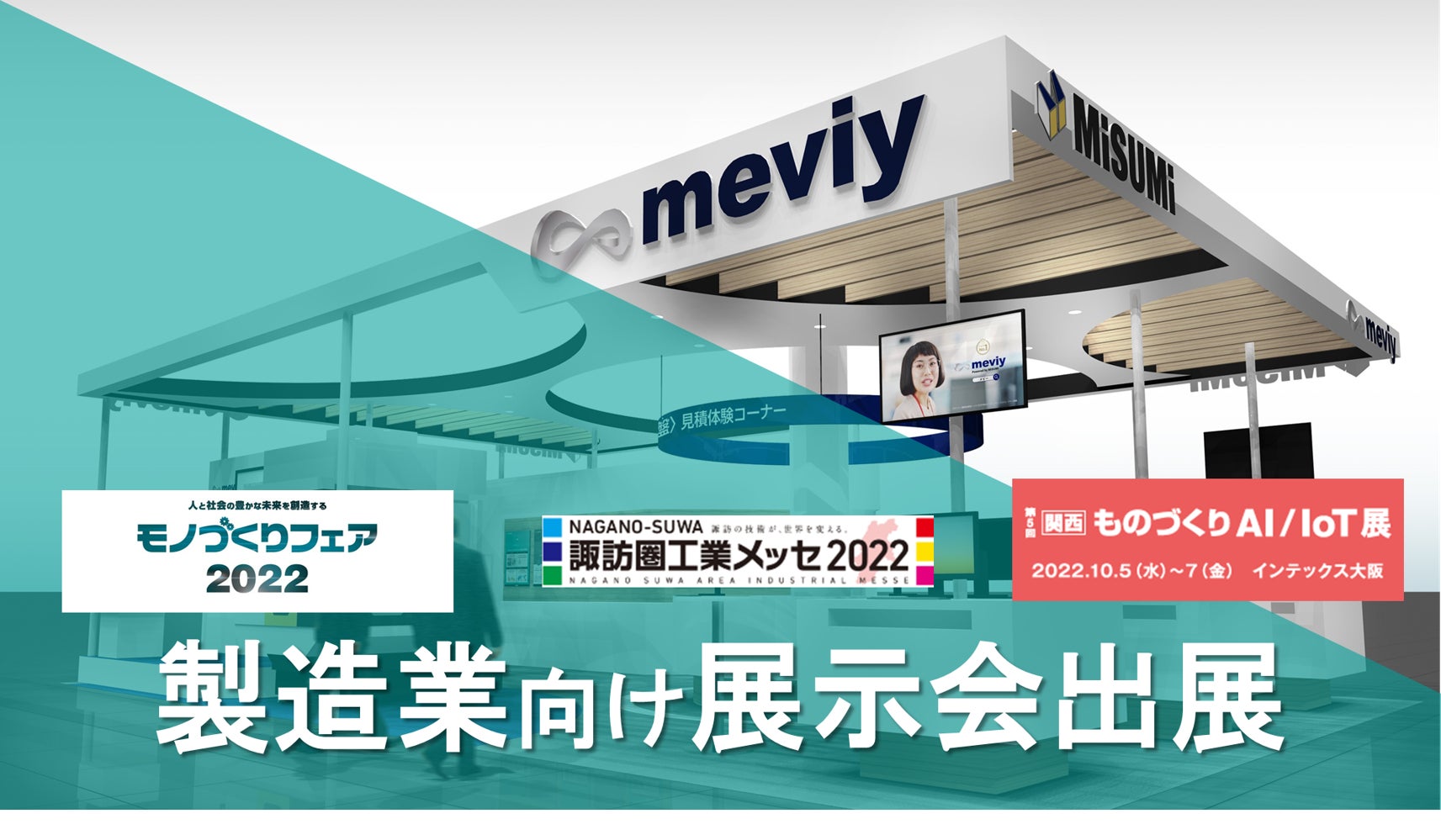 株式会社ミスミグループ本社が提供するデジタル機械部品調達サービス「meviy(メビー)」は、10月5~7日 にものづくりAI/IoT展(インデックス大阪)、ものづくりフェア2022(マリンメッセ福岡)、13~15日には諏訪圏工業メッセ2022(諏訪湖イベントホール)に出展することをお知らせします。