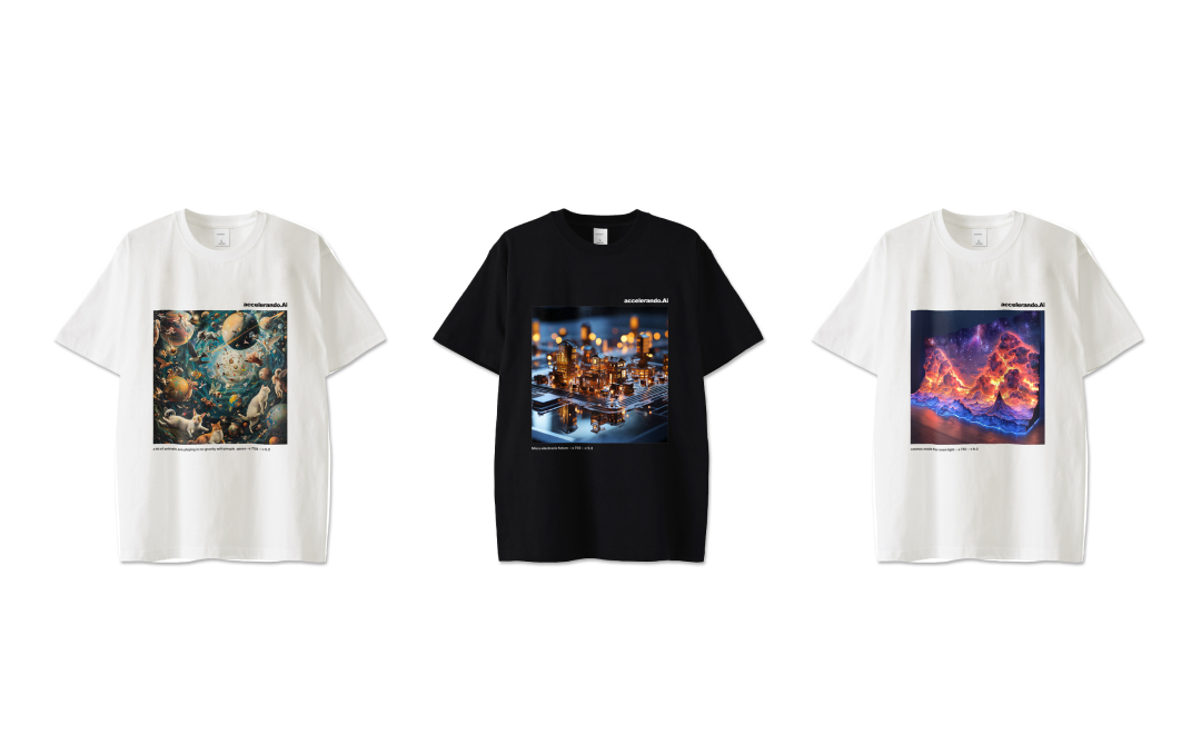 各テーマごとに選ばれた10作品は、OpenFashion社が提供するファッションブランド「accelerando.Ai((アッチェレランドドットエーアイ))」より、生成されたアートデザインと、そのプロンプトがプリントされたリアルクローズ「プロンプトTシャツ」として販売予定です(※)。さらに全世界で4億人のユーザーが参加するメタバースプラットフォーム「ゼペット」でも、アバターが着用できるアイテムとして販売予定となっております。この夏の1枚にぴったりなデザインで、ぜひコンテストにご参加ください。