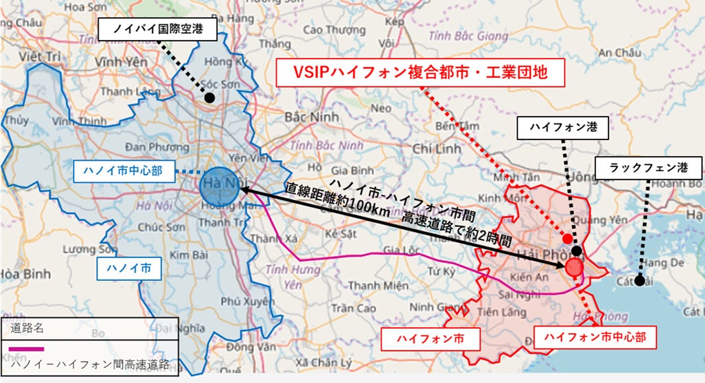 本物件が立地するVSIPハイフォン複合都市・工業団地は、下図のとおり、ベトナム北部最大の港湾都市であるハイフォン市に位置しており、また同市と首都ハノイ市は主要幹線道路で結ばれておりアクセスに優れていることから、広域物流拠点として高い優位性を有しています。