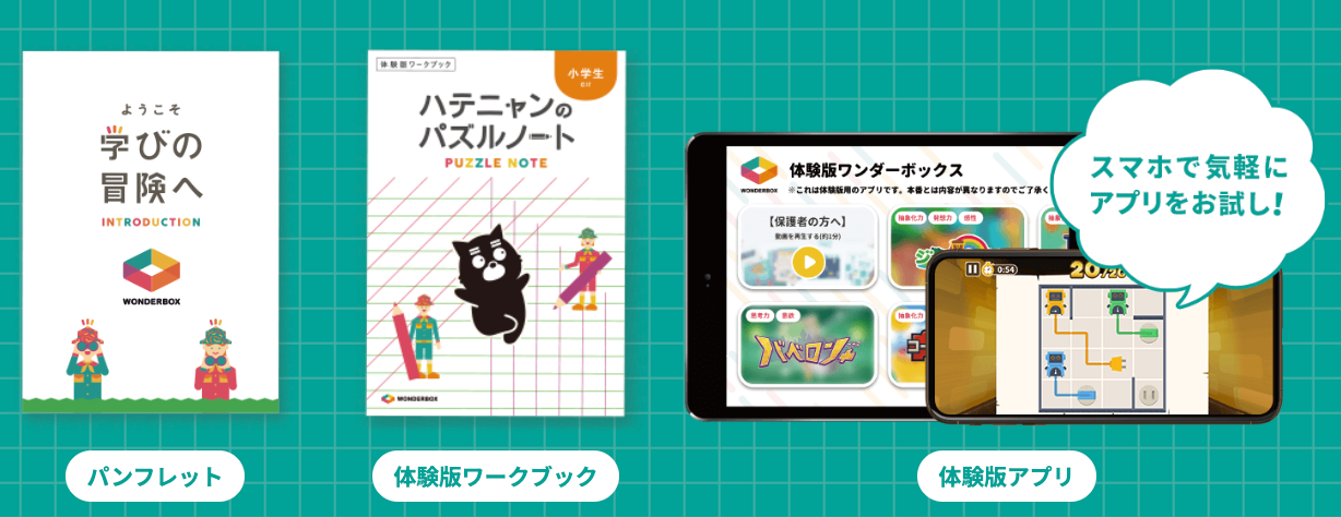ご都合や遠方で参加が難しい方は、ワンダーボックスの無料資料請求をご活用ください。詳細のパンフレットやアプリ教材が体験できるだけでなく、思考力ワークブックもついてきます。ぜひご家庭でSTEAM教育・ワンダーボックスをご体験ください。
