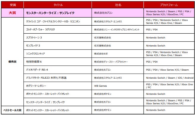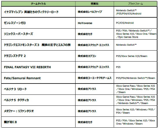 「日本ゲーム大賞2023」 各賞受賞作品/受賞者