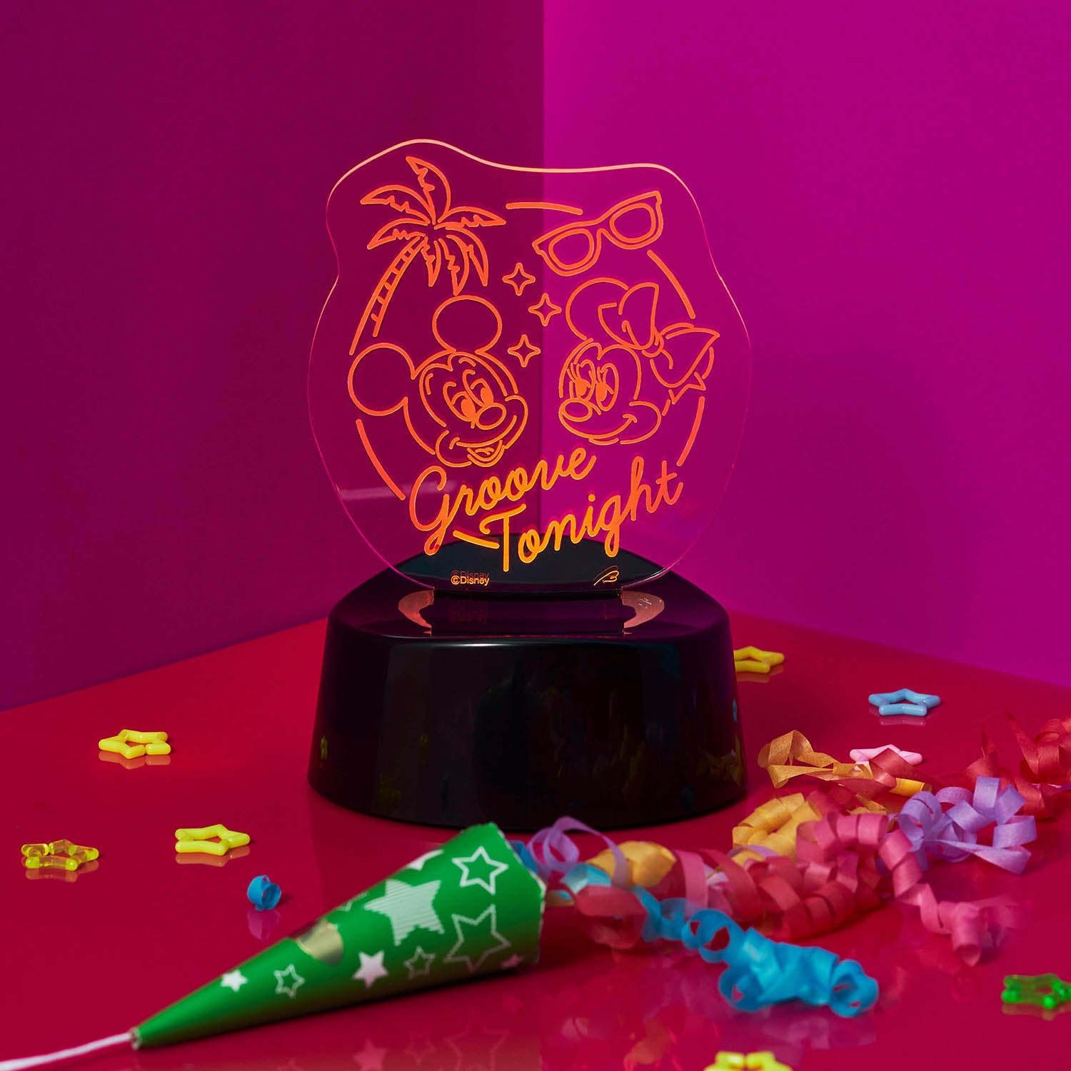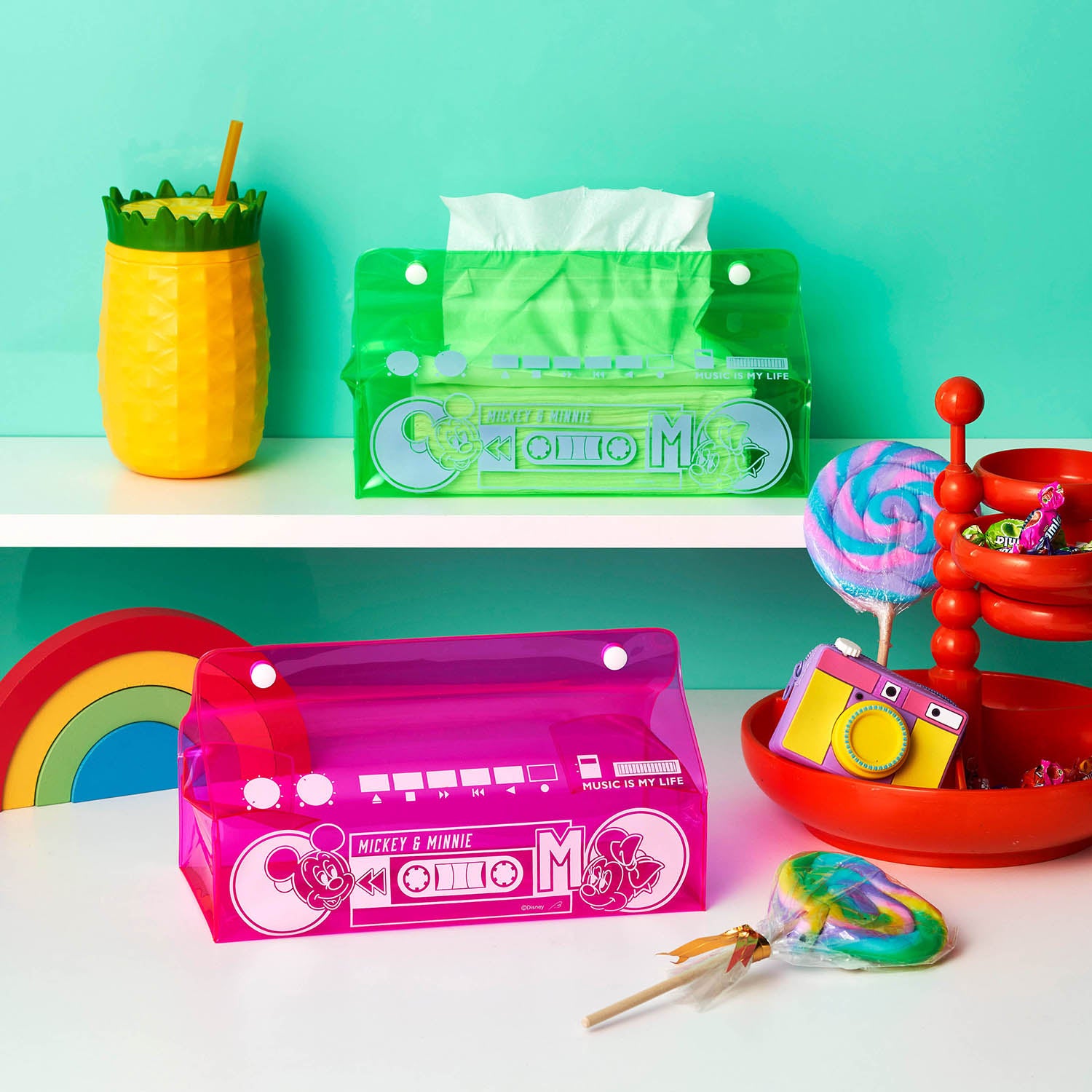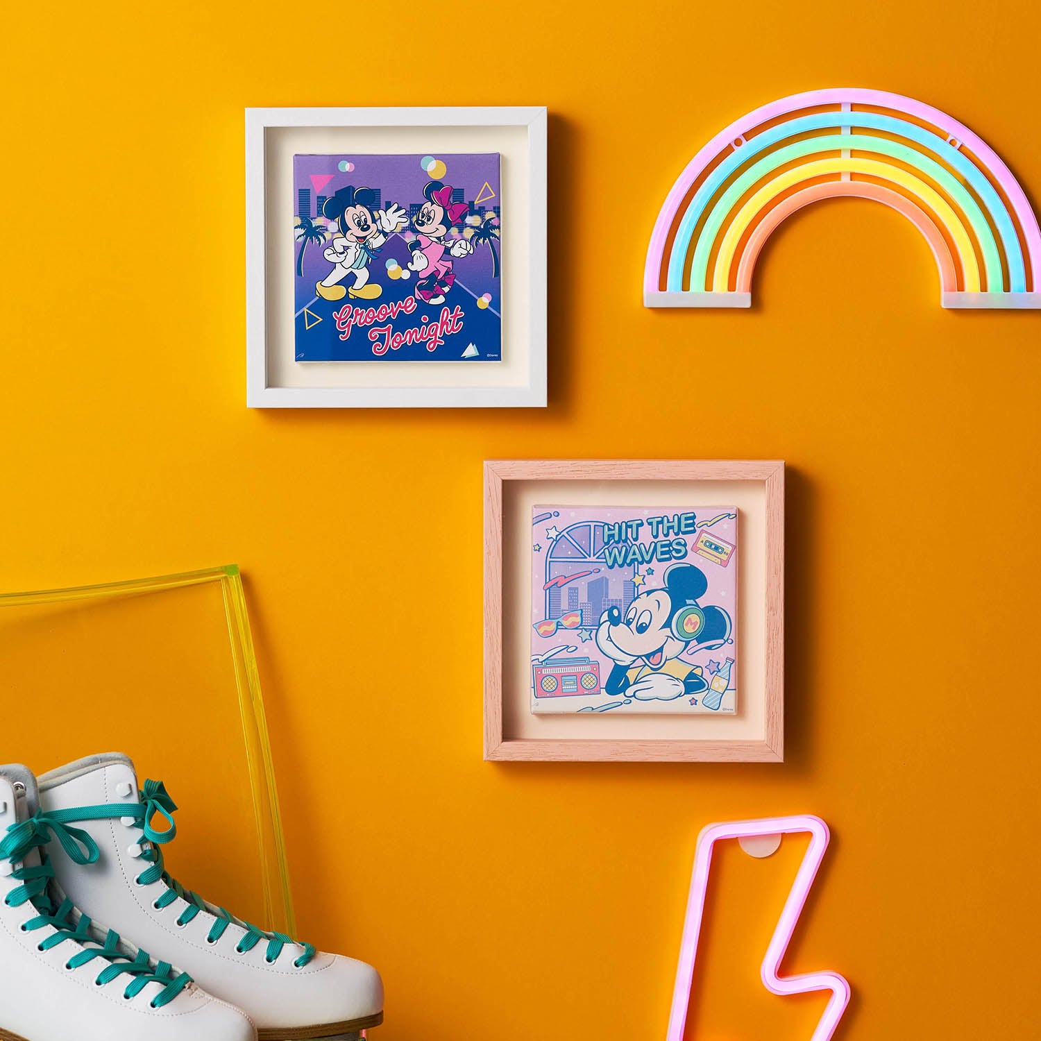 「レトロポップ」がテーマ。暗い場所で光る蓄光プリント使いのショルダーバッグやラジカセデザインのティッシュケース、ネオンサイン風アクリルライトなど、80年代の流行や雰囲気を取り入れた目を引くデザインがポイント。お揃いコーデができるユニセックスTシャツは、凸凹のある発泡プリントやさりげないラメプリント使ってキャラクターを表現しており、テーマパークに行くときはもちろん、大人のディズニーファンが普段のファッションにも取り入れることができるアイテムです。また、インテリア雑貨はお部屋に置くだけで80年代にタイムスリップしたかような空間を演出することができます。