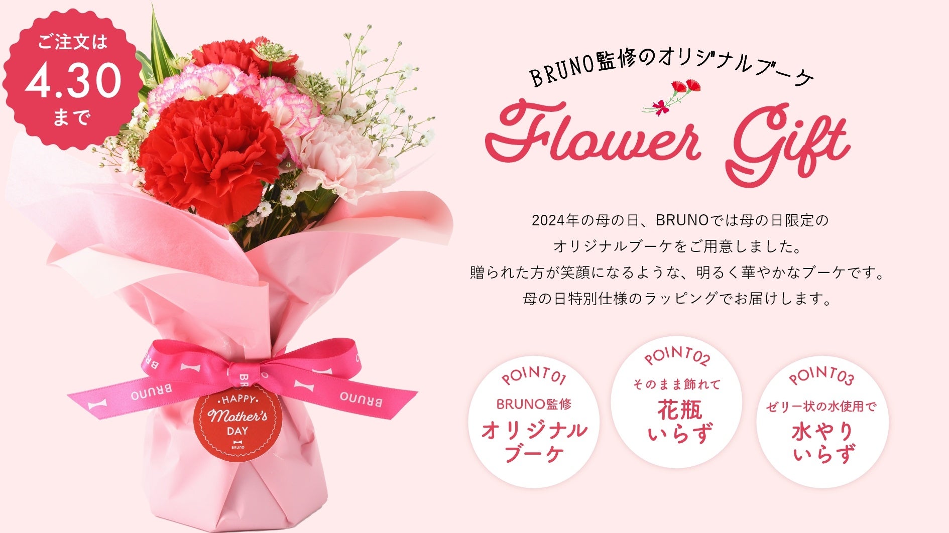 ※ブーケの受付は、4月30日までとなります。詳しくは、BRUNO母の日特集ページをご確認ください。