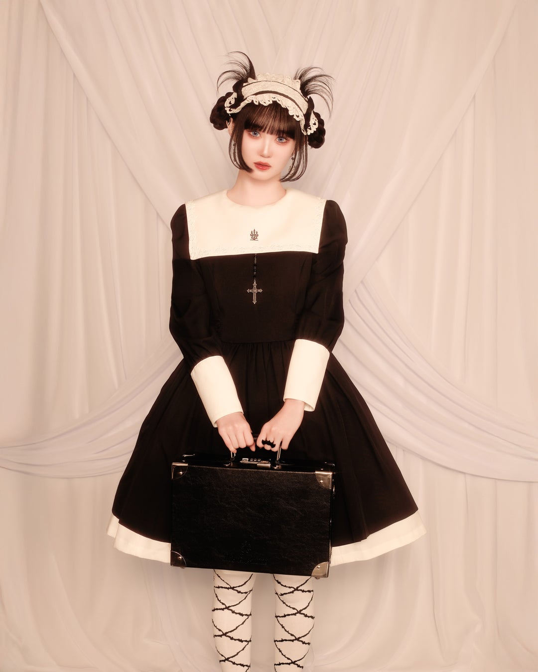 「ファントムシータについては、正直知りませんでした。しかし、スタッフに勧められてMVを観てみたところ、レトロホラーというコンセプトで作られた楽曲も映像も、まさに自分の好みの世界観で、とても惹かれました。去年デビューしたばかりだと聞き、その完成度にも驚きました。 こうした新しい世代のアーティストたちに、Moi-même-Moitiéの世界観を纏ってもらうことには、大きな意味があると感じました。この企画ではいつも、変身後のエレガントな姿をお披露目してきましたが、今回は少し趣向を変えて、変身前と変身後、その両方を見せるストーリー仕立てにしてはどうかと考えました。 憧れの存在に想いを寄せる少女と、その憧れの対象である人物——その両方をひとりで演じることで、洋服やヘアメイクの持つ『変化の力』を、より感じてもらえるのではないかと思ったのです。 Moi-même-Moitiéというブランド名は、『moi-même(自分自身)』と『moitié(半分)』という意味を持っています。私自身これまでにも、男性役と女性役、あるいは天使と悪魔といった、相反する存在を表現してきました。 "どちらでもなく、同時にどちらでもある"—そんな曖昧で神秘的な在り方には、特別な魅力があります。美の概念を超越する…それが私の描く永遠のテーマです。Moi-même-Moitiéを纏う人たちにも、お洋服を通して『自分が完成する感覚』や『なりたい自分になれる喜び』を感じてもらえたら、嬉しく思います。」