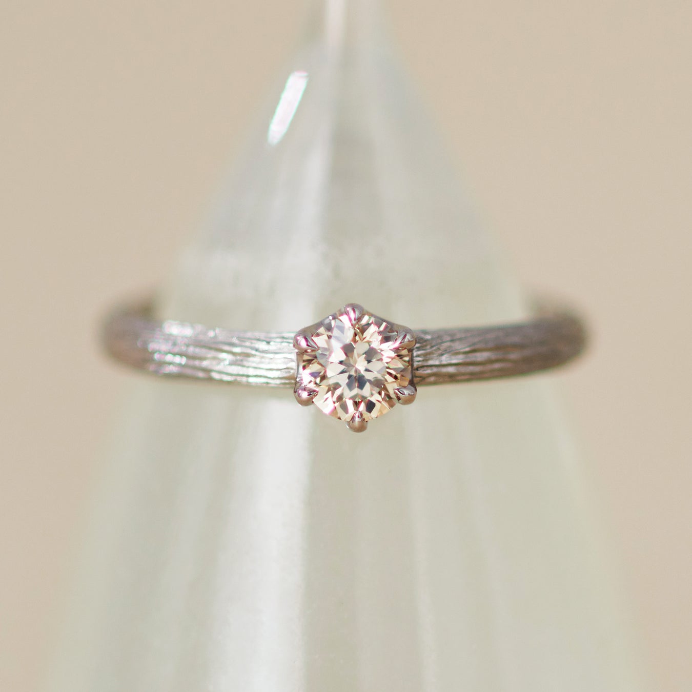 通常のラウンドブリリアントカットダイヤモンドよりも輝きが穏やかなため、普段づかいの婚約指輪にもぴったりです。