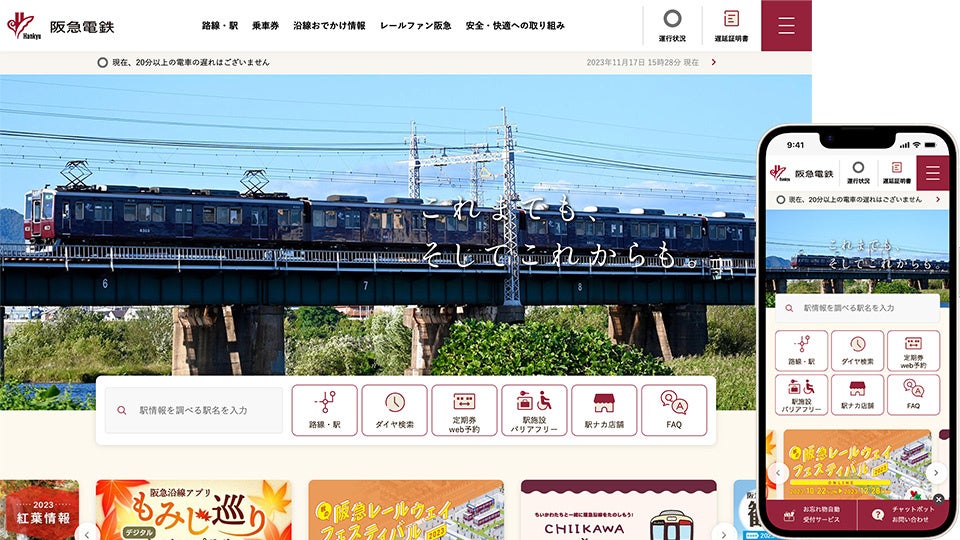 阪急電鉄の旧公式サイトは鉄道情報を中心にさまざまな情報を発信してきた一方、構築から10年が経過しコンテンツの量も増加したことから、欲しい情報への簡単なアクセスやスマートフォンでの使いやすさなど、多くの課題がありました。今回のリニューアルでは「コンテンツの整理」「レスポンシブデザインの採用」「UXを重視した設計」を取り入れ、ユーザーがより使いやすいウェブサイトへ生まれ変わりました。また、各部門が独自に運用していたスキームを刷新し共通のCMS(コンテンツ管理システム)を導入したことで、全コンテンツを集約しながら運用の内製化と業務効率化にも貢献しています。