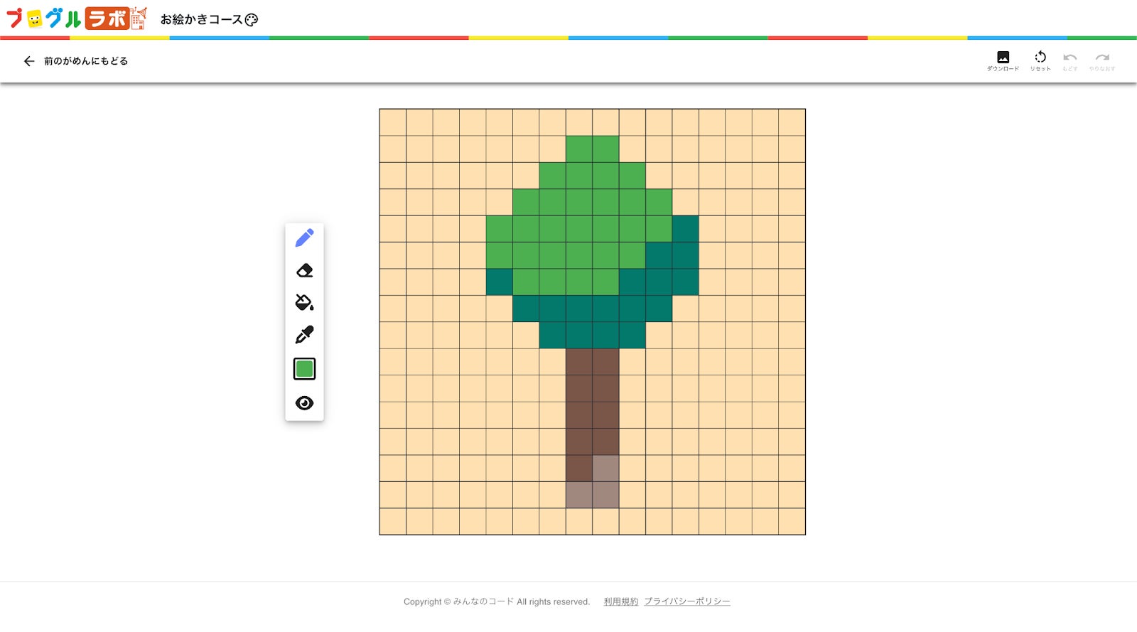 「お絵かきコース」では、児童・生徒が画面上でドット絵を描くことにより、デジタル表現について学ぶことができます。