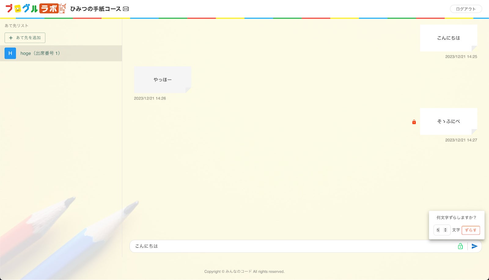 「ひみつの手紙コース」では、ネット上でメッセージの暗号化と復号化を行いながら、暗号化の基本とプライバシーの重要性を学びます。