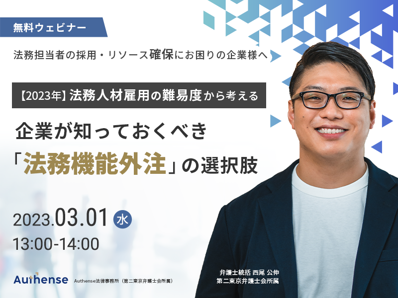 <無料ウェビナー開催3.1>【2023年】法務人材雇用の難易度から考える 企業が知っておくべき「法務機能外注」の選択肢|Authense法律事務所