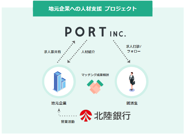 ポート株式会社(代表取締役社長CEO:春日 博文、所在地:東京都新宿区、以下「当社」)は、株式会社北陸銀行(代表取締役頭取:中澤 宏、所在地:富山県富山市、以下「北陸銀行」)と顧客紹介で連携し、顧客基盤を活用した地元企業への雇用推進プロジェクトを開始いたしましたので、お知らせいたします。