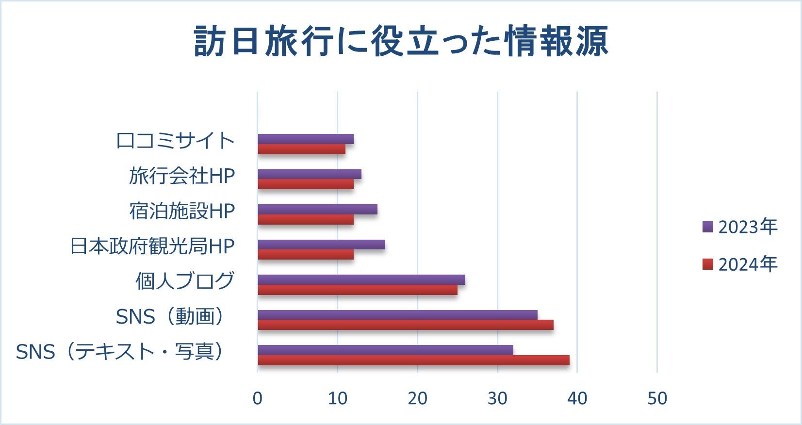 ネット普及により、距離や言語に関係なく情報共有する現代、国内では外国人へ届ける情報網が未整備である。観光事業者は、訪日旅行者の情報源の1位:SNS(テキスト・写真)、2位:SNS(動画):観光庁調べ、を鑑み、インバウンドの来訪に繋がる導線をオンライン上に構築すべきである。