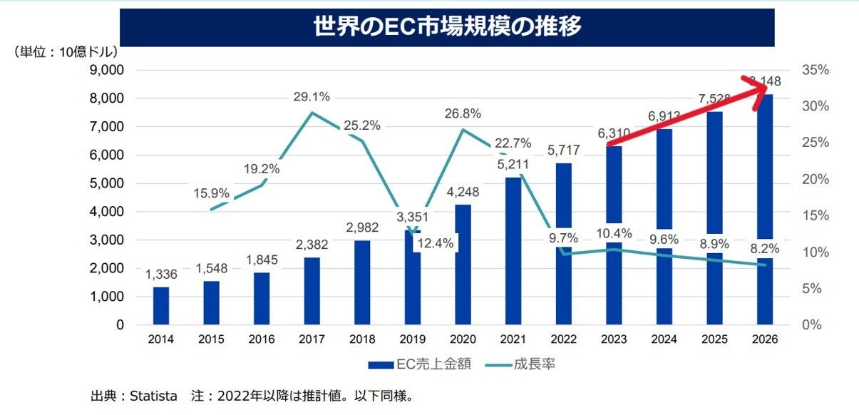 海外市場に活路を見出すことで、事業者は新たな顧客を獲得し、自社の経済基盤や信頼度向上、ひいては国内経済の活性化に貢献できる。実際、日本の輸出市場は26年に10,500,00億円へ増加の見込み(財務省試算)。世界のEC市場も26年にかけて8~11%の伸長と試算され、成長が期待できる。