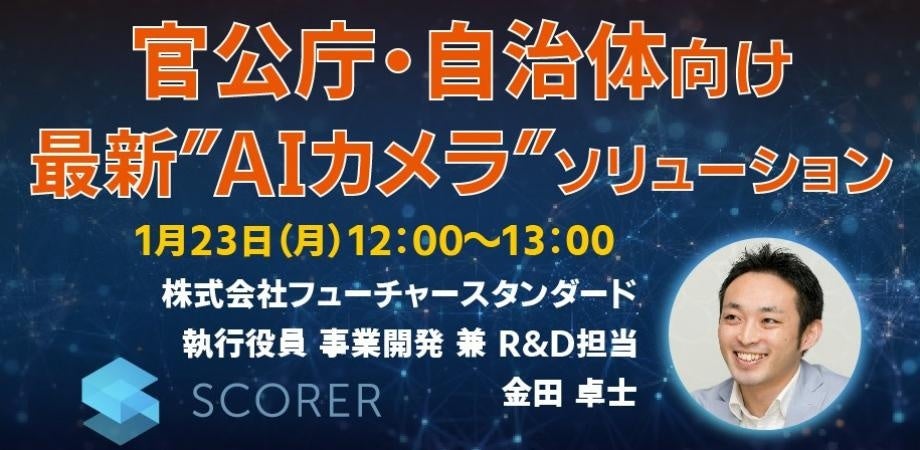 映像解析AIプラットフォーム「SCORER(スコアラー)」を運営するフューチャースタンダード(本社:東京都台東区、代表取締役:鳥海哲史 以下、フューチャースタンダード)は、1月23日(月)12時に無料ウェビナーを開催し、最新AIカメラの活用方法を官公庁・自治体の導入事例をふまえて紹介いたします。