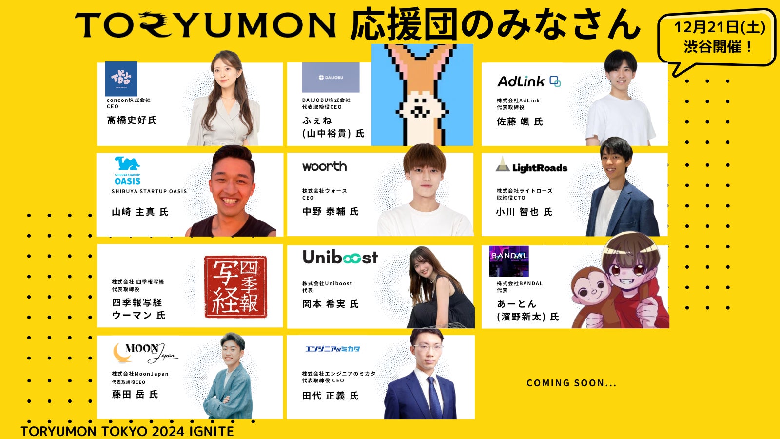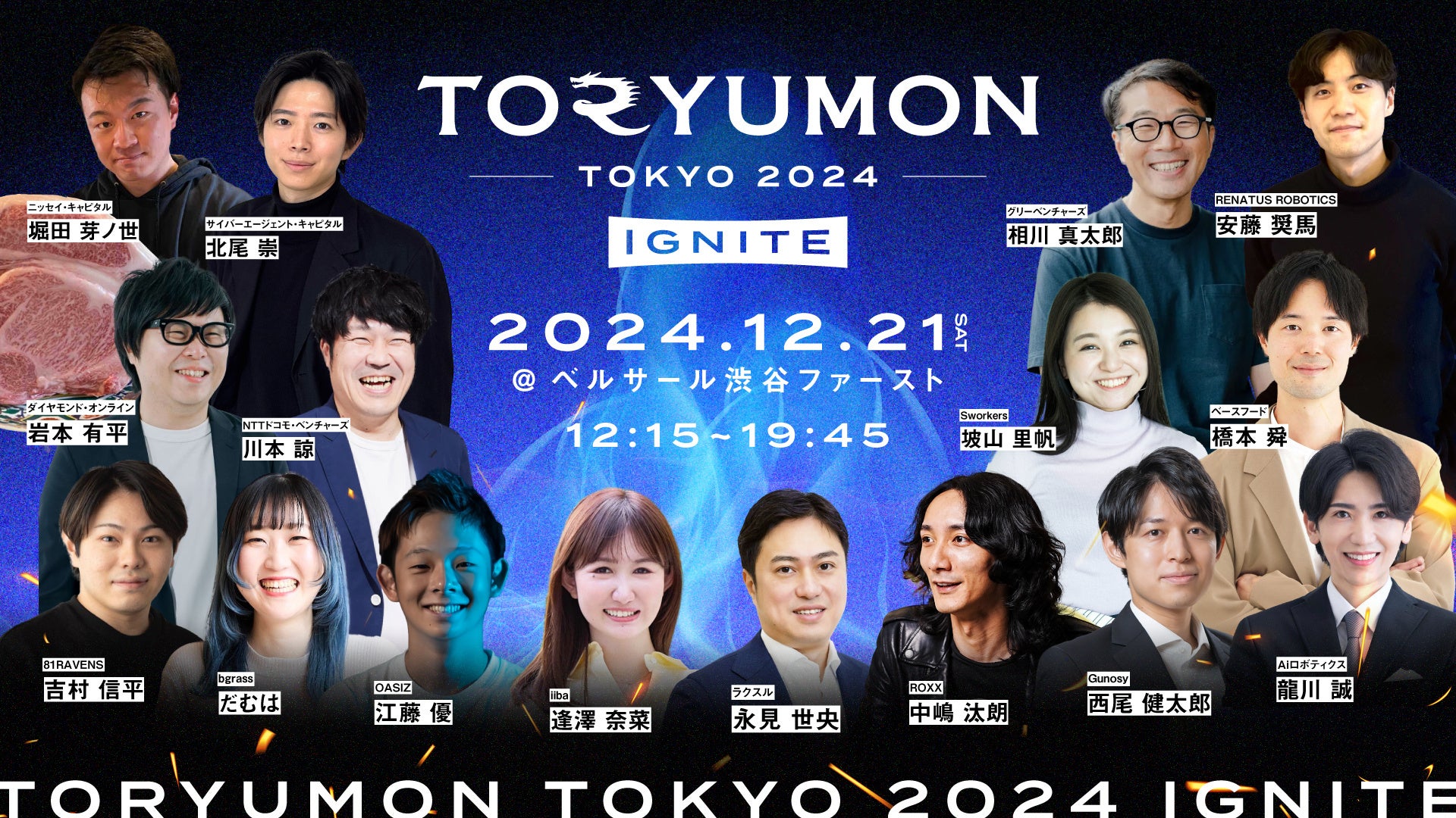2024年12月21日(土)に開催いたします、U25世代向けスタートアップイベント「TORYUMON TOKYO 2024 IGNITE」の全コンテンツ及び全登壇者および無料化が決定いたしました。