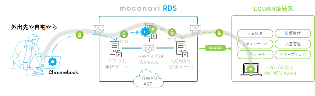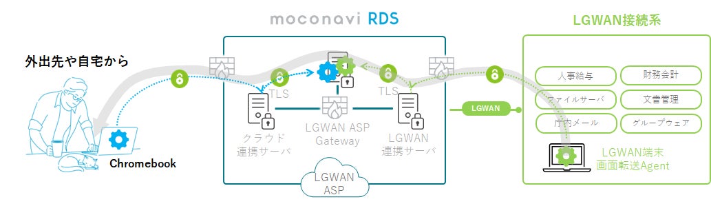今回、職員のDX推進として職員の働き方改革を目的に、庁外から庁内システムにセキュアにアクセスするため「moconavi RDS LGWANリモートアクセスサービス」を導入いただきました。すでに導入済みのモバイルパソコンであるChromebookから利用することで、コストパフォーマンスとセキュリティを高めたリモートアクセス環境を実現しました。