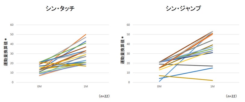 〇車いすの方、片麻痺の方などさまざまな疾患をお持ちの方や運動が苦手な方でも、その方のレベルに合わせた難易度を自動調整するゲーム(自動難易度調整ゲーム/運動機能)を、対象者22名の方に週1回以上実施していただいたところ、多くの方が実施の前後で運動量のスコアが上昇しました。
