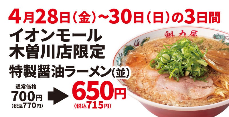 この度オープンを記念して、「イオンモール木曽川店」にご来店いただいたお客様には、『特製醤油ラーメン(並)』を650円(税込715円)で販売いたします。