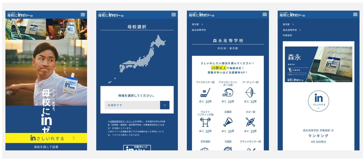 本気でがんばる部活生を応援したいという想いから、母校の後輩たちへ「inゼリー」を無料でさしいれすることができる「特設サイト(さしいれプラットフォーム)」を開設。全国約5,000高校(※定時制・通信制なども含む)の中から、応援したい部活に投票をすると、10票以上の投票があった部活から抽選で500部活に「inゼリー エネルギー」(1ケース 36個入り)がOB/OGからのさしいれとして無料でプレゼントされます。また、得票数が多くなるほど当選確率が上がり、OB/OGの応援次第でがんばる後輩たちにさしいれが届く確率が高くなります。