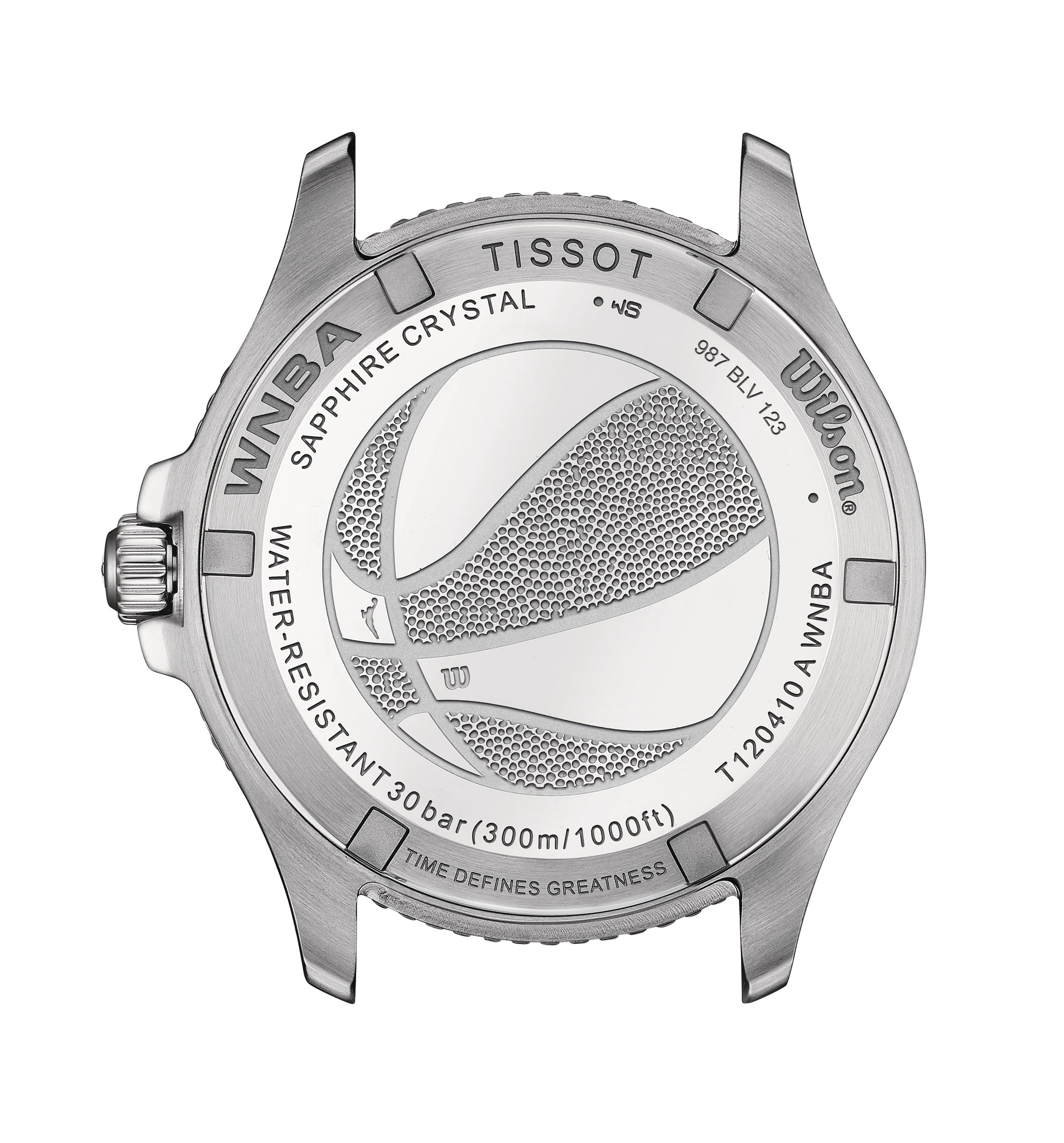 ケースバックには、ティソ、Wilson®、WNBAをフィーチャーしたWNBA Wilson®バスケットボールがデザインされています。