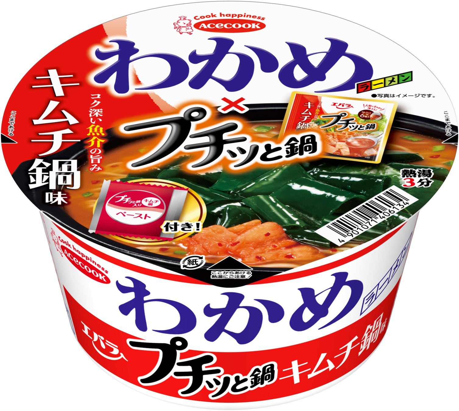当社は、エースコックと2023年12月に初めてコラボレーションを実施し、「黄金の味」をイメージした2種のスーパーカップをエースコックから発売しました。その取り組みが好評だったことから、このたび「わかめラーメン」と「プチッと鍋」のコラボレーションが実現。デザインは「プチッと鍋」の世界観を踏襲し、“わかめラーメン×プチッと鍋”の文字を大きく入れることで視認性を向上させました。「プチッと鍋入りペースト」で仕上げるこだわりの味わいで、寒い季節にほっと一息つける、ココロもカラダも温まる一杯です。