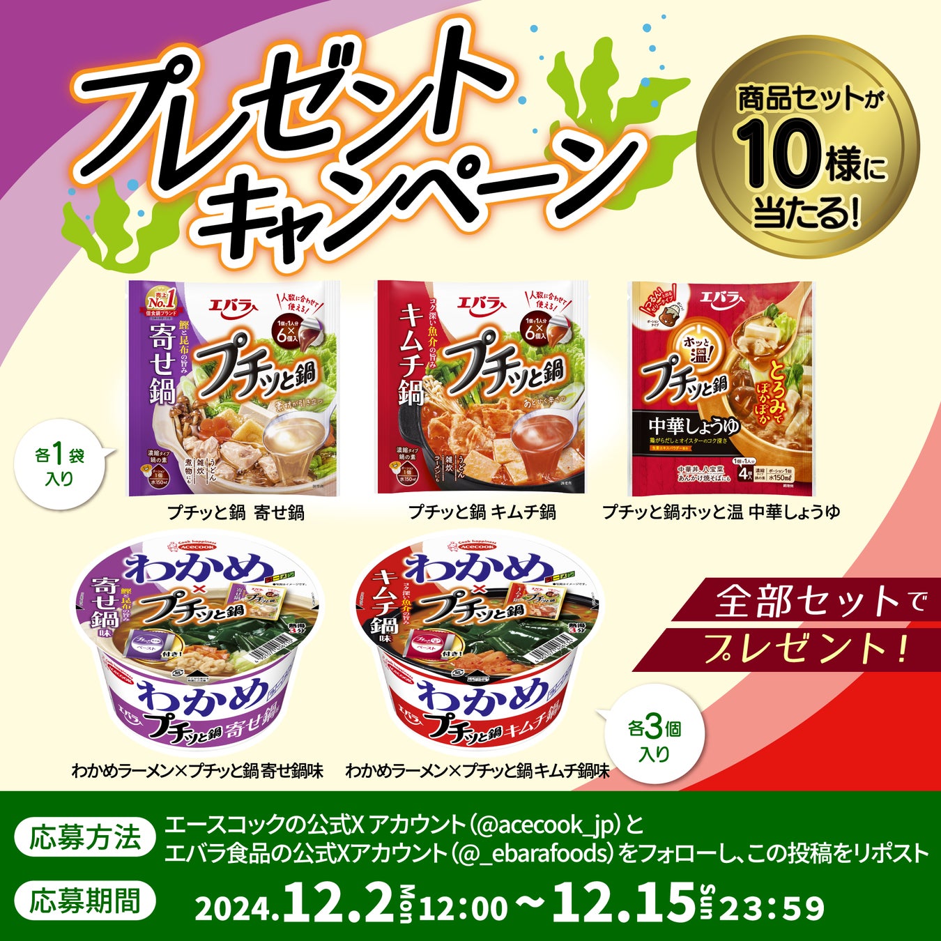 賞品:エースコックとのコラボ商品「わかめラーメン×プチッと鍋 寄せ鍋味」「わかめラーメン×プチッと鍋 キムチ鍋味」各3個と、当社の「プチッと鍋 寄せ鍋」「プチッと鍋 キムチ鍋」「プチッと鍋ホッと温 中華しょうゆ」各1袋を詰め合わせにして10名様にプレゼント。