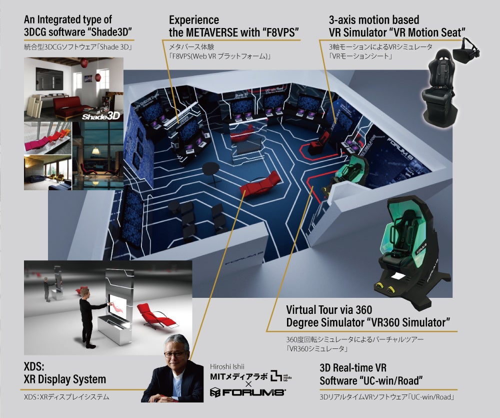 弊社は、「VRでイマジネーション、イノベーション!」をテーマに、デジタルツイン、メタバースを実現する国産VRCGソフトウェアソリューションとして、統合型3DCGソフトウェア「Shade 3D」、WebVRプラットフォーム「F8VPS(フォーラムエイトバーチャルプラットフォームシステム)」、3次元バーチャルリアリティソフト「VR Design Studio UC-win/Road」、クロスプラットフォームゲームエンジン「スイート千鳥エンジン」を中心に紹介します。VRコンテンツ・シミュレータ、地震シミュレータおよび解析系ソリューション等の最新ソリューションを一堂に展示し、Shade3Dによるイタリアのデザイン家具メーカTecnoとのコラボレーション「XDS:XRディスプレイシステム」(Hiroshi Ishii MITメディアラボ × FORUM8)や、各ソリューションの体験コーナ、プレゼンテーションコーナを設けます。