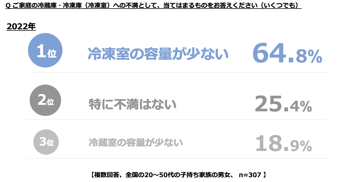 - 全体の約9割が家庭に「今以上の冷凍スペースが必要」と回答。冷蔵庫への不満1位も「冷凍室の容量が少ない」