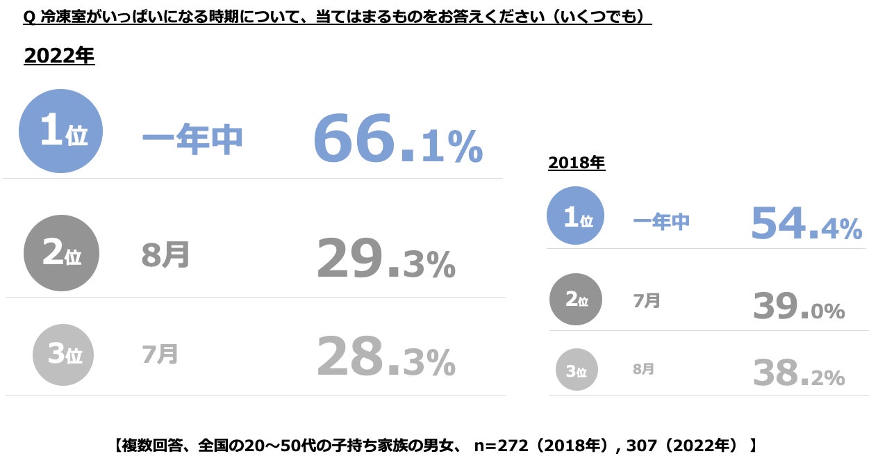 「冷凍庫(冷凍室)がいっぱいだと感じる」と回答した家庭に対して、冷凍室がいっぱいになる時期について聞くと、「1年中」という回答が全体の半数以上となる66.1%を占める結果に。2018年調査時は「1年中」が54.4%と、11.7ポイントの増加となり、全国のご家庭の冷凍スペースがひっ迫していることがわかります。