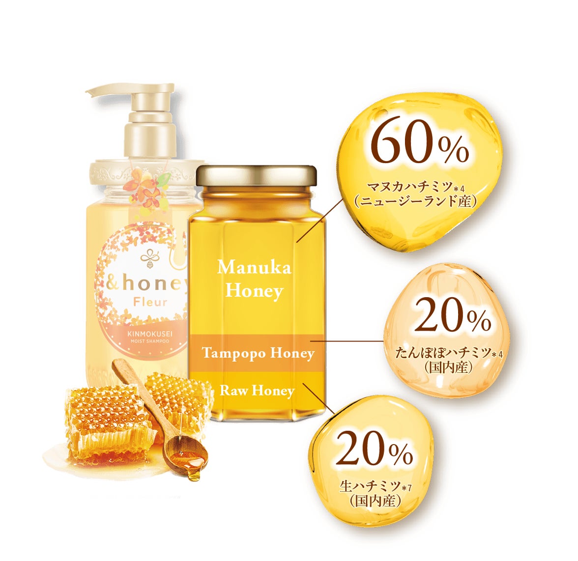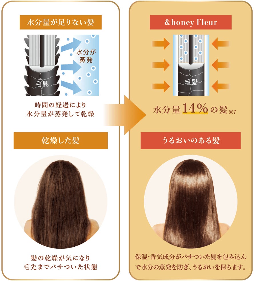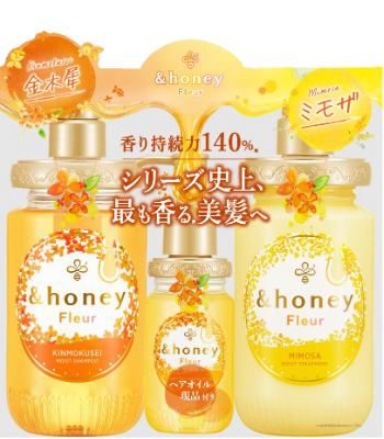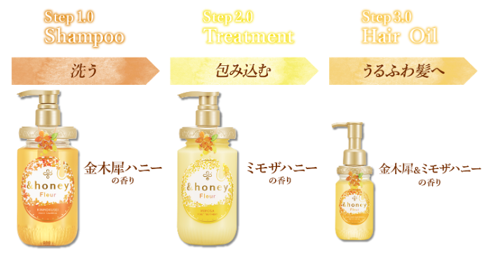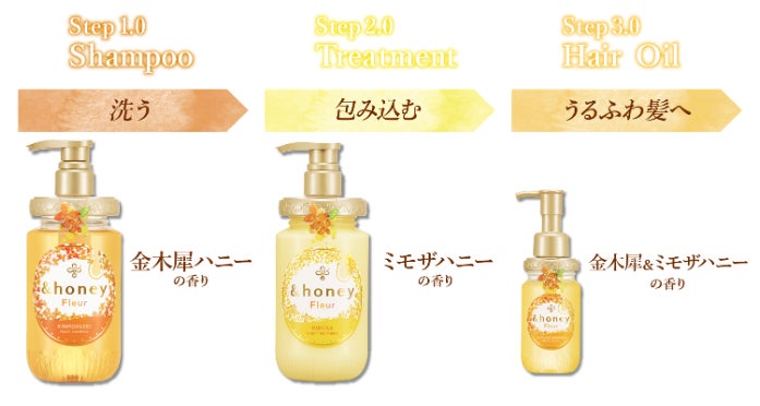 &honey Fleurは厳選した香り高い金木犀*1とミモザ*2を採用し、シリーズ史上最も香る※1、甘く上品なフレグランスで髪も心もリラックス※2するアイテム。