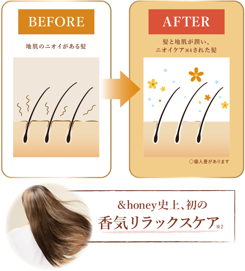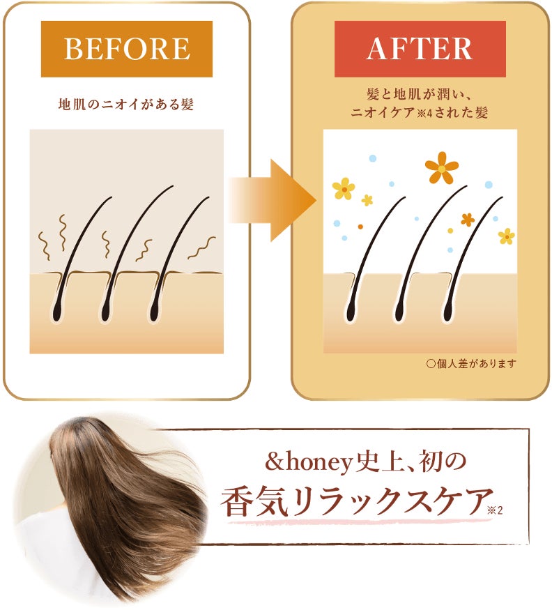 香気成分 *3とハチミツ *4の力で気になるニオイをケアし ※4 地肌から毛先まで香り潤う髪へ導きます。