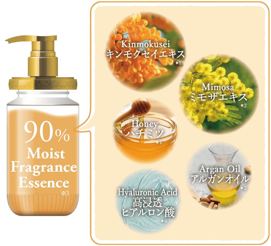 *3 モクセイ花エキス(シャンプー・ヘアオイルに配合)・ミモザアカシア花エキス(ヘアトリートメント・ヘアオイルに配合)(全て香気・保湿) *4 保湿
