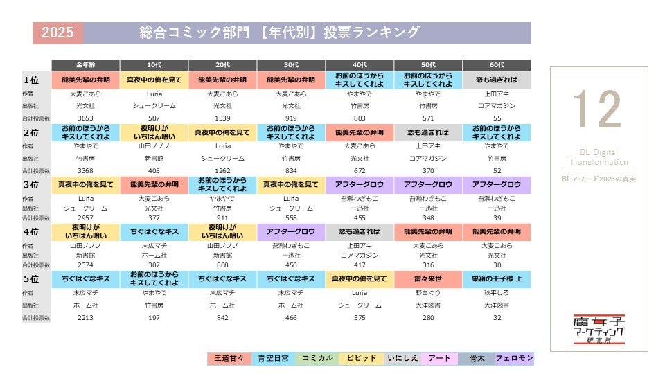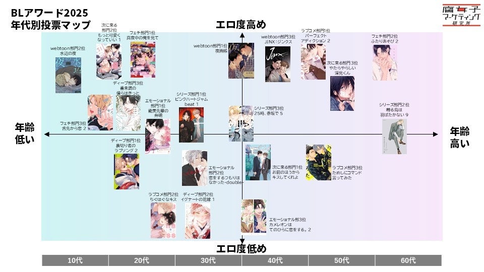また40~60代ではの年齢層では王道甘々な作品が人気、セクシー度低めのストーリー重視作品は年齢偏らず支持されてました、BLアワード2024と比べて甘々王道BLが上位に増えましたが、このトレンドはこのまま続くのでしょうか。本セミナーでぜひ今後の流れを掴んでください。