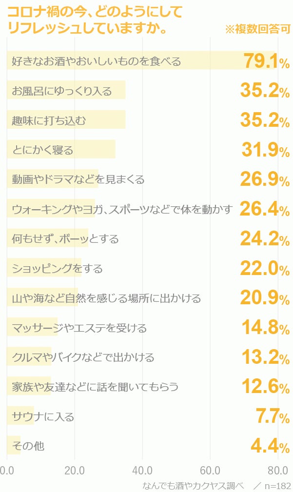 さて結果はというと、最も支持を集めたのは「好きなお酒やおいしいものを食べる」で79%、2位は「お風呂に入る」と「趣味に打ち込む」で同率の35%でした。「おいしいお酒とおつまみがいい時間となり、気分転換につながる」というコメントが寄せられましたが、そう考える人は多いようで、2位以下を大きく引き離してトップに輝きました。