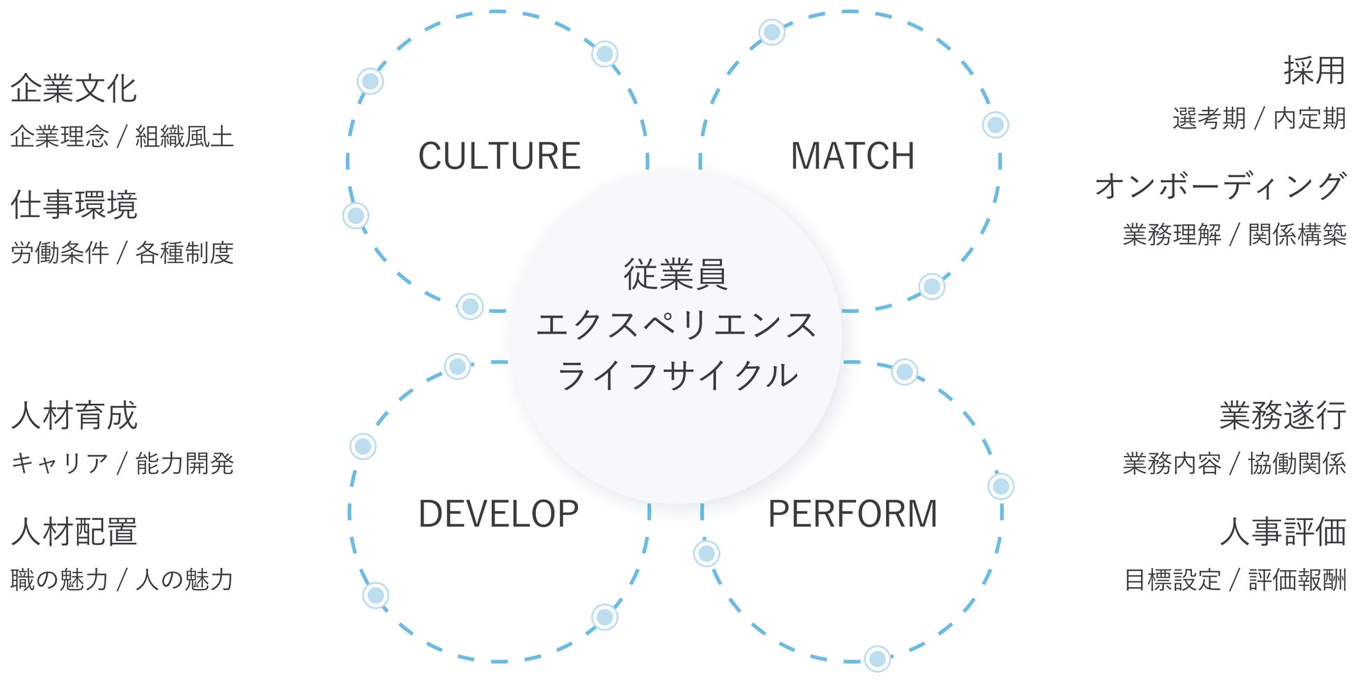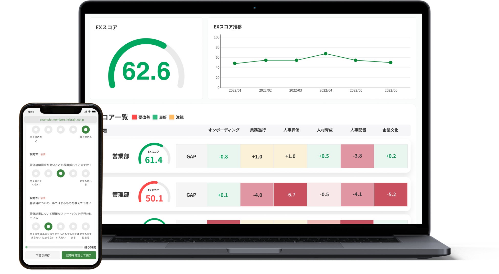 EXスコア®とは、従業員の期待値と実感値をもとに算出した組織状態を表す指標で、HRBrainの登録商標です(EX=Employee Experience)。採用・オンボーディング・業務遂行・人事評価・人材育成・人材配置・仕事環境・企業文化というエンプロイージャーニーに沿って設計された16の領域を対象に、従業員へのアンケートを通じてデータを収集。部署や年代、役職など様々な属性における働きがい・働きやすさを定量的に可視化します。同業他社との比較にも対応しており、投資家などのステークホルダーに対する人的資本の情報開示にも活用可能です。(特許出願済)
