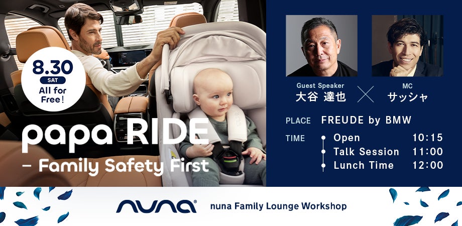 ベビーギアブランド「nuna(ヌナ)」が贈る、子育てをもっと心地よく、楽しくする体験型ワークショップ「nuna Family Lounge Workshop」。第5回目となる今回は、パパにフォーカスした特別プログラム「papa RIDE – Family Safety First」を開催します。