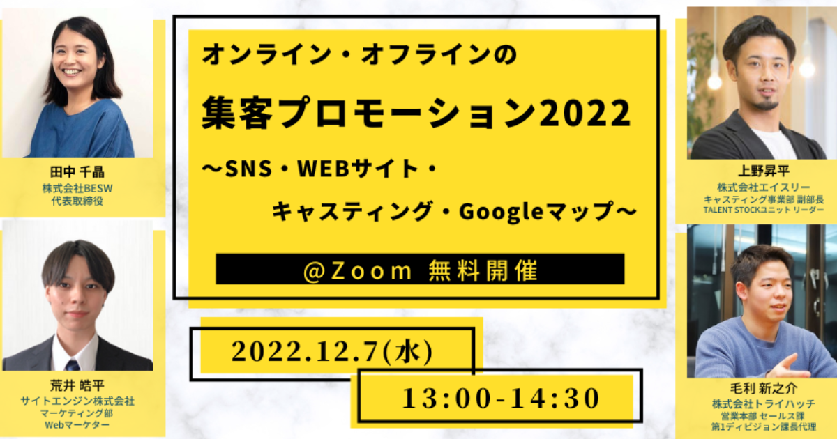 「自己表現にテクノロジーとアイデアを」を経営理念としてWebマーケティング支援サービスを提供するサイトエンジン株式会社(本社:東京都台東区 代表取締役:毛塚 智彦)は、2022年12月7日(水)13:00~14:30に、株式会社BESW(本社:東京都渋谷区 代表者:田中 千晶)、株式会社エイスリー(本社:東京都渋谷区 代表取締役:山本 直樹)、株式会社トライハッチ(本社:東京都新宿区 代表取締役社長:武藤 尭行)との "オンライン・オフラインの集客プロモーション2022 ~SNS・Webサイト・キャスティング・Googleマップ~" を開催します。