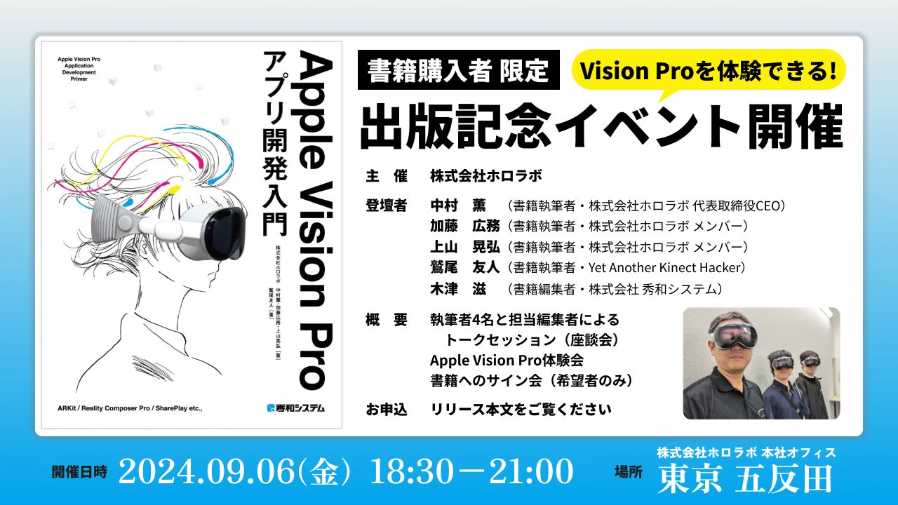 株式会社ホロラボ(本社:東京都品川区、代表取締役CEO:中村 薫、以下「ホロラボ」)は株式会社秀和システム(東京都・代表取締役会長兼社長 上田智一、以下「秀和システム」)より2024年8月24日に発売される『Apple Vision Proアプリ開発入門』を共同執筆しました。弊社における執筆担当者は中村 薫、加藤 広務、上山 晃弘の3名です。