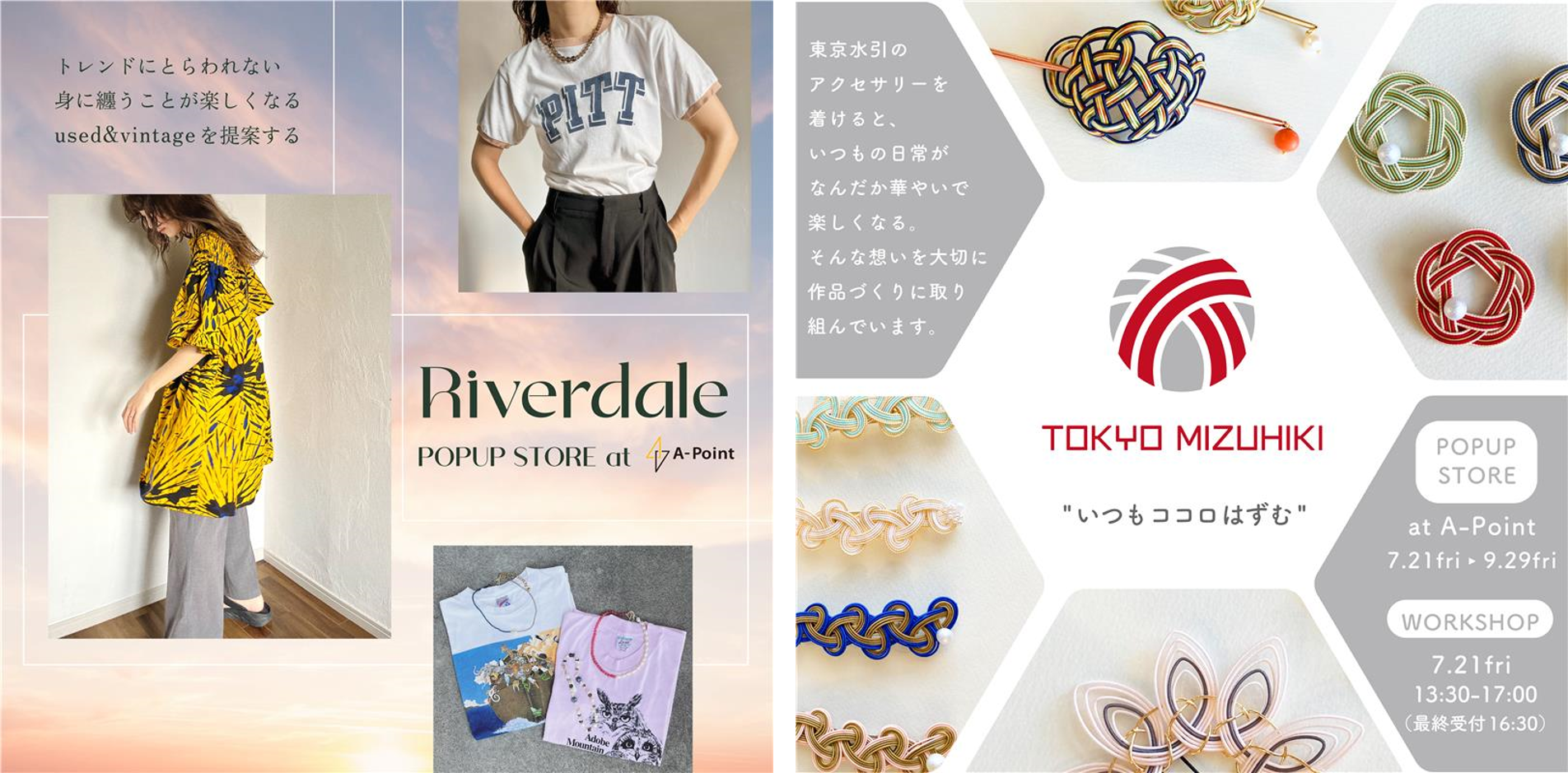 7月21日(金)から9月29日(金)までの期間は、used&vintageアパレルブランドの「Riverdale(リバーデイル)」(https://riverdalevtg.theshop.jp/)と、日本の伝統文化の水引をアップデートするアクセサリー・アートブランド「TOKYO MIZUHIKI(東京水引)」(https://tokyomizuhiki.com/)のPOP UP STOREを展開します。入退場は自由です。