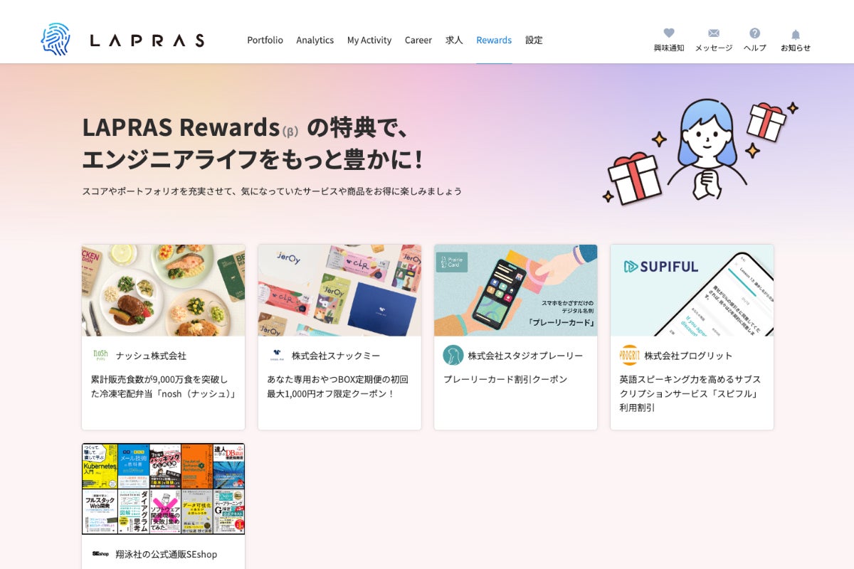 LAPRAS株式会社(所在地:東京都渋谷区、代表取締役:染谷健太郎、以下「LAPRAS」)は、ITエンジニアのアウトプットを応援し、成長を支援する特典プログラム「LAPRAS Rewards」(β版*1)を開始します。本プログラムでは、技術力スコアの向上やアウトプット活動の継続などを条件に、ITエンジニアとしての学習や生活をサポートする特典を提供します。