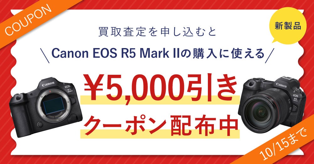 システムファイブでは、新商品『EOS R5 Mark II』の導入応援キャンペーンとして、システムファイブが買取可能なカメラ製品の中古買取査定をお申し込みいただくと、『EOS R5 Mark II』をおトクにお求めいただける特別クーポン(5,000円OFF)をもれなくプレゼントいたします。さらに、買取査定価格も通常より15%アップとなります。