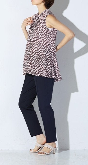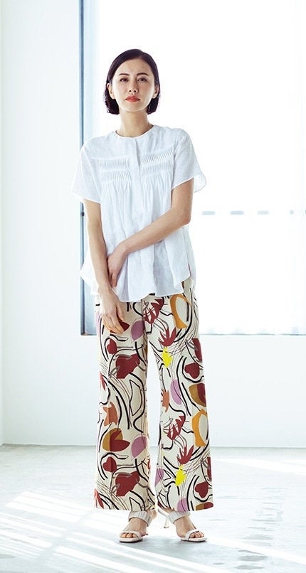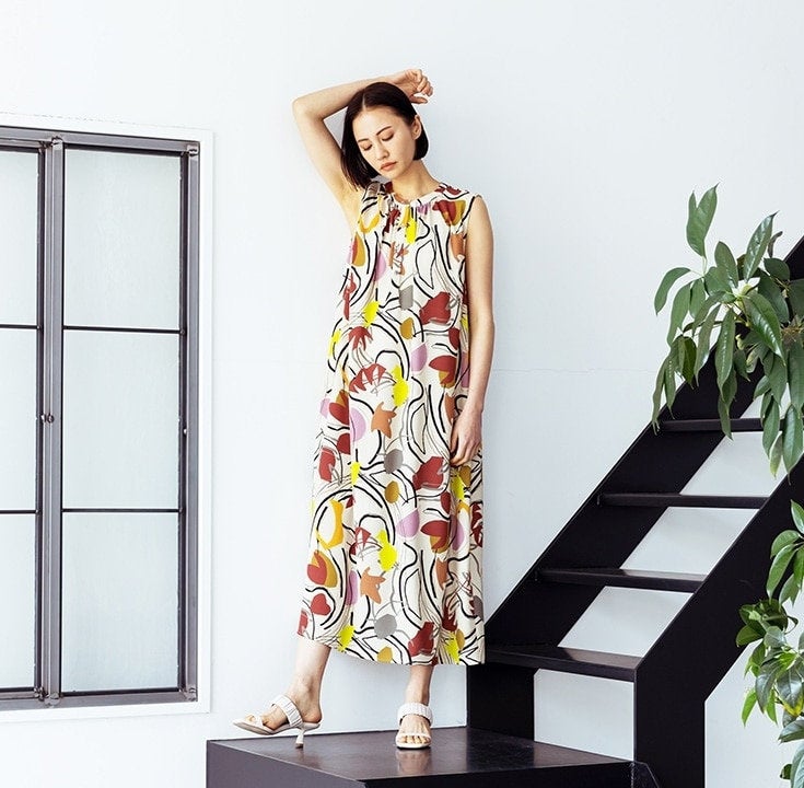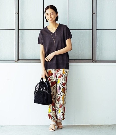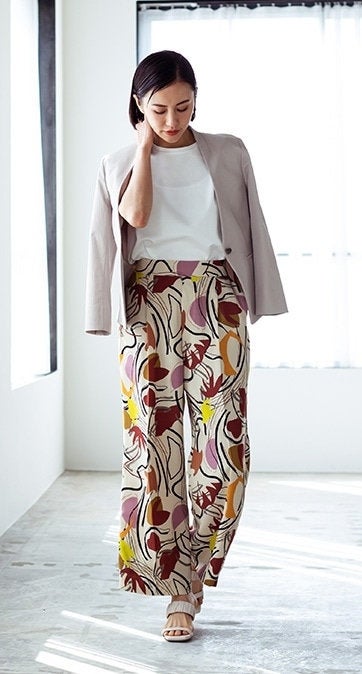 ダイナミックな柄行きにも関わらず、全体的にノスタルジックなカラーでまとめ、落ち着いた雰囲気に。ブラックのラインが全体を引き締めでモードな印象に。落ち感のあるドレーピーな素材なので、きれいめにもスタイリング。