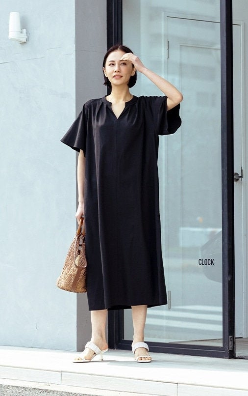 たっぷりとした分量感がリラクシングな印象のタックフレアーワンピース。フラットサンダルやバスケットとコーデしてリゾート気分に。ベルトでウエストマークしてきれいめにも!